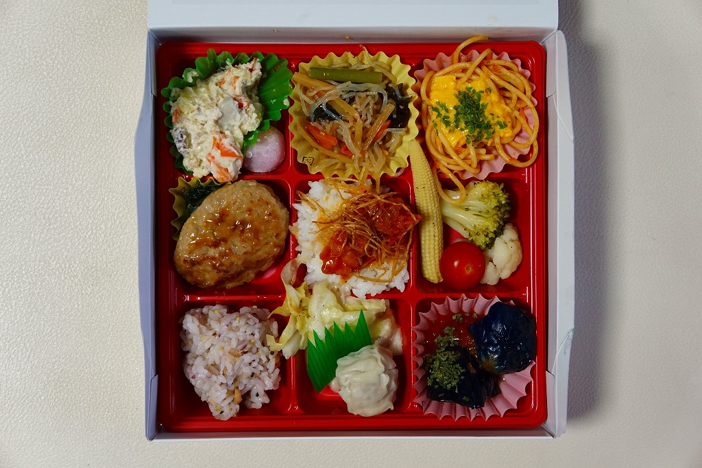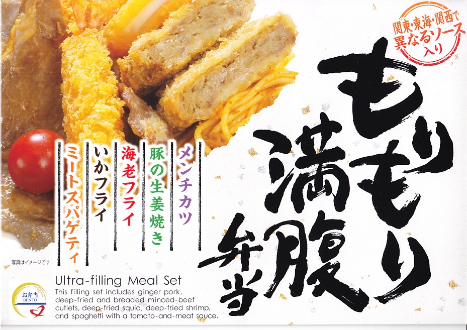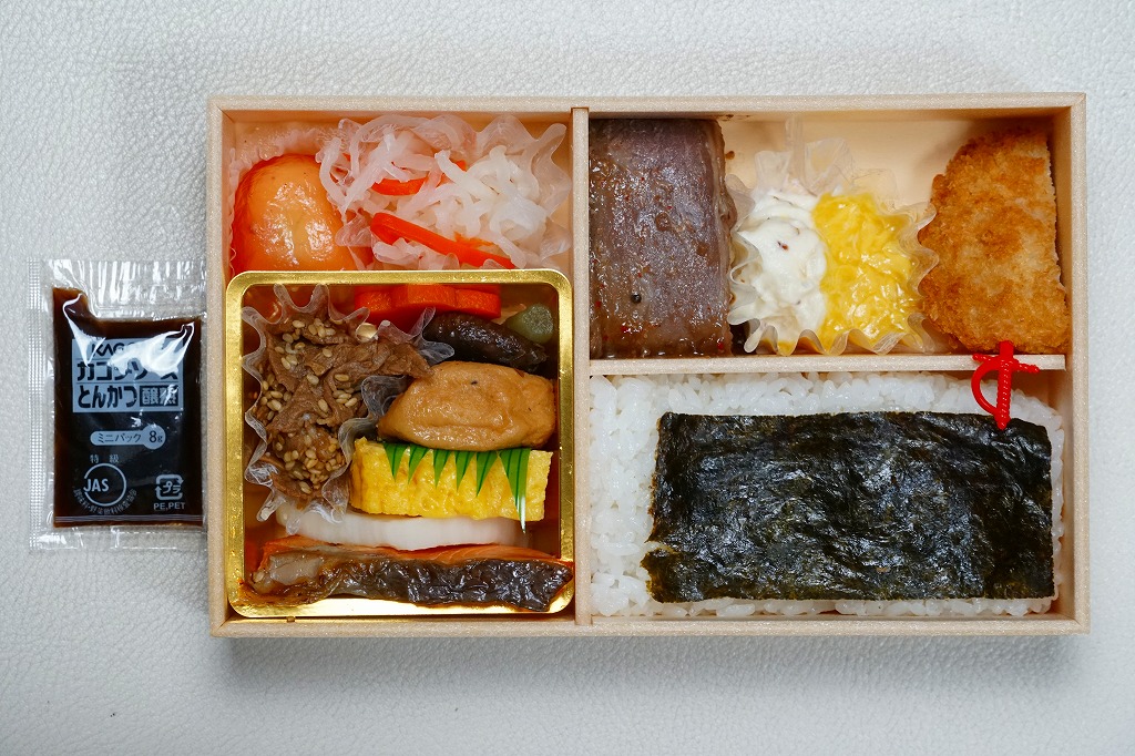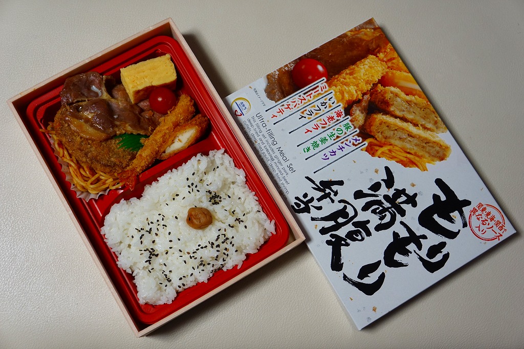 2017(平成29)年6月21日の発売。日の丸ごはんに、メンチカツ、豚の生姜焼き、海老フライ、いかフライ、ミートスパゲティという、ふたに記されたおかずたちと、玉子焼とミニトマトを添える。肉と油と脂と炭水化物で、容赦ない構成。1年弱ほどの販売か。