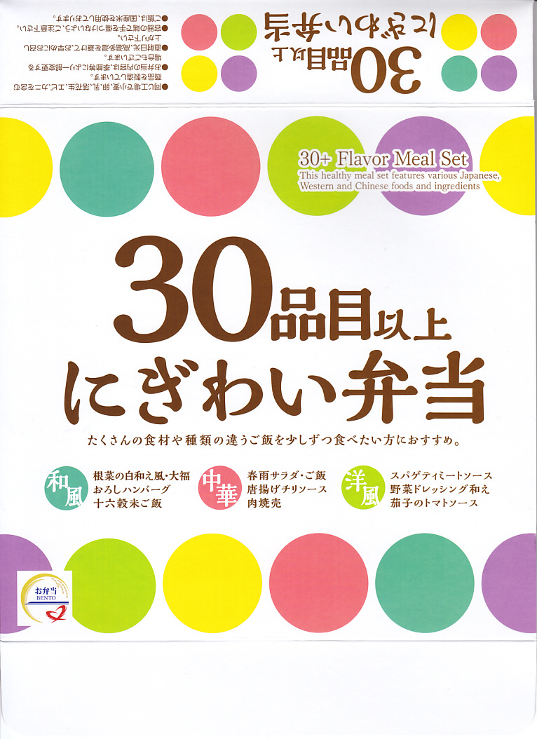 2015(平成27)年の夏頃の発売か。その名とコンセプトはきっと、同じ東京駅で売られる日本レストランエンタプライズ(NRE)の「30品目バランス弁当」を意識したのではないかと思う。中身はパッケージに書かれるとおり、9区画のトレーの3区画が「和風」で「根菜の白和え風・大福」「おろしハンバーグ」「十六穀米ご飯」、3区画が「中華」で「春雨サラダ・ご飯」「唐揚げチリソース」「肉焼売」、3区画が「洋風」で「スパゲティミートソース」「野菜ドレッシング和え」「茄子のトマトソース」。ごちゃごちゃと賑やかに、いろんなものを詰めている。不思議と、飯と麺状の物と擦り物が目立つ気がした。価格は2017年の購入時で920円、2019年にいったん終売し、2020年に940円で復活。2022年までの販売か。
