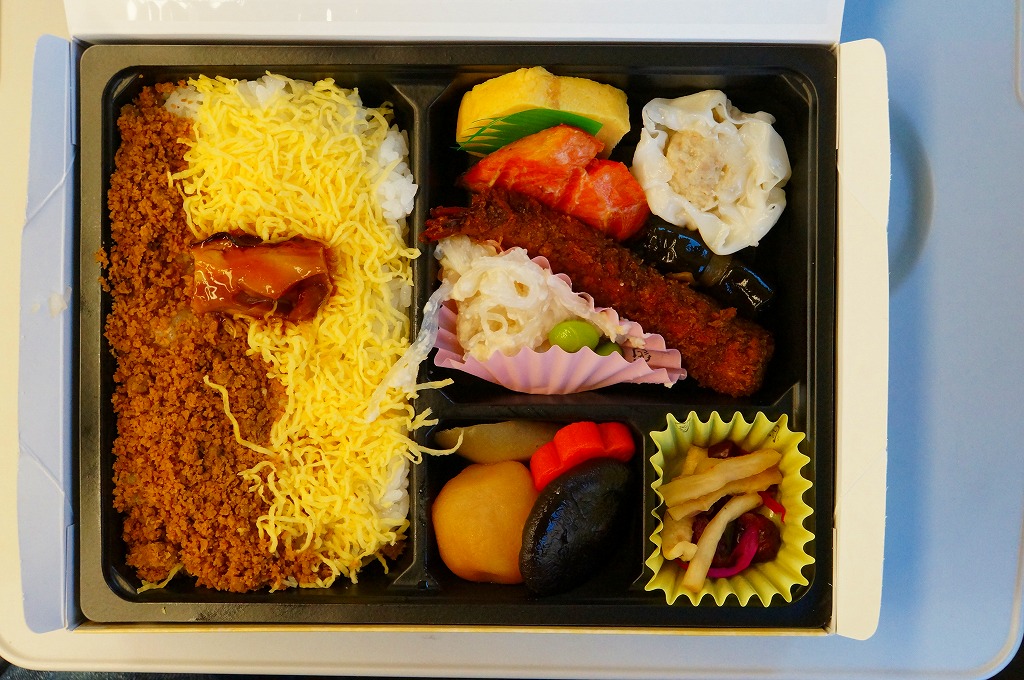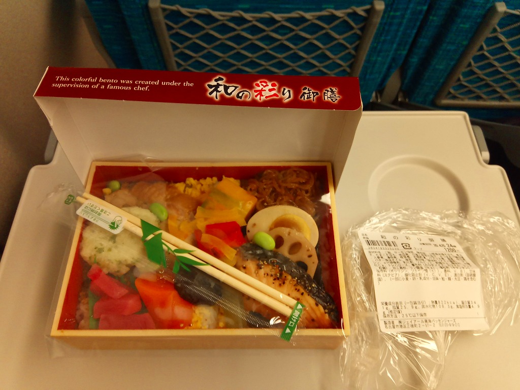 2019(令和元)年12月12日に東京、品川、新横浜の各駅で発売。後に名古屋、京都、新大阪の各駅でも販売したのだろうか、今回は名古屋駅で購入。東京都新宿の日本料理店「鈴なり」店主の村田明彦による監修といい、その半身と中身の写真をふたに使う。中身は、容器に敷き詰めた白飯を、鶏そぼろと玉子そぼろで覆い、鶏照焼、サーモン焼、カボチャやニンジンなどの煮物、煮玉子、糸こんにゃく、パプリカ、漬物を散らしてさらに覆うもの。この種の商品は、いにしえの東京駅「ニッポンの駅弁」以来、おなかいっぱい。1年間ほどの販売か。