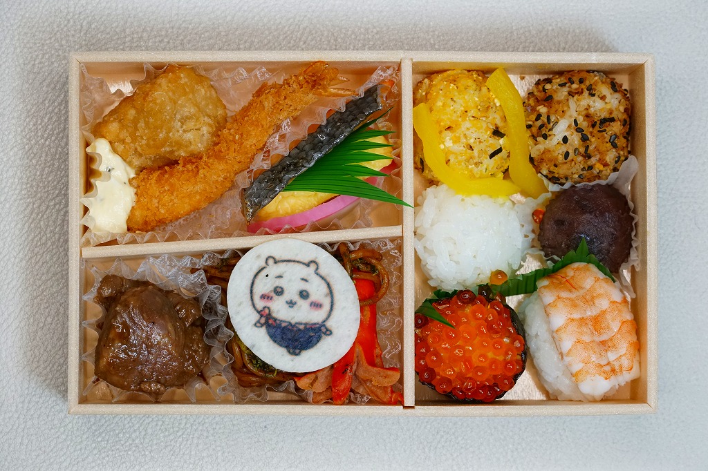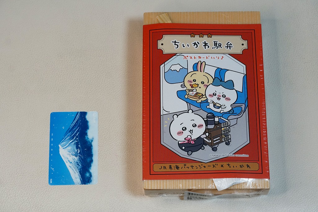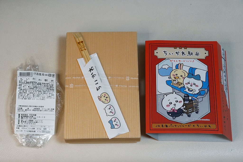 発泡材のプラ容器を収めたスリーブには、東海道新幹線の列車内で弁当を食べる、アイスを食べる、車内販売員で3体のキャラクターが描かれた。中身は塩飯、いくら、ふりかけ2種、しいたけ、えびで6個のてまりずしに、鶏唐揚、エビフライ、焼鮭とかまぼこと玉子焼、焼きそばとたこ型ウインナー、ひとくちステーキ、あんこだんご、たくあん。割りばしにもちいかわの名前と顔が描かれ、3種のポストカードのうちひとつとおしながきを添付。キャラクターの駅弁なので高価だし、中身などどうてもよいものだが、渋く落ち着いた内容と食べやすい盛り付けで、弁当として見ても悪くない。