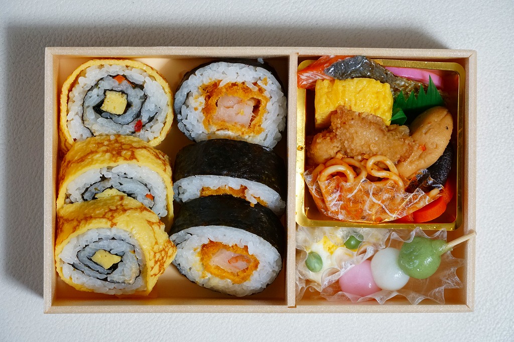 そのため、駅弁のスリーブと箸袋とおしながきにキャラクターを描き、中身にもそんな絵柄の筒が入り、さらに今回は全14種類のノベルティカードのうち「かしゅうきよみつ」とある1枚を封入する。中身はいなり寿司、かんぴょう巻寿司、たまご巻寿司、4種の具のおにぎりご飯、唐揚げ、ハンバーグ、玉子焼、タコさんウインナー、ポテトサラダ、合鴨スモーク、煮物、草団子。御飯物7個が4本分となり、シートに包んでキャラクターの紙筒に入っていた。調理でなく詰めるのに手がかかりそうな記念駅弁。