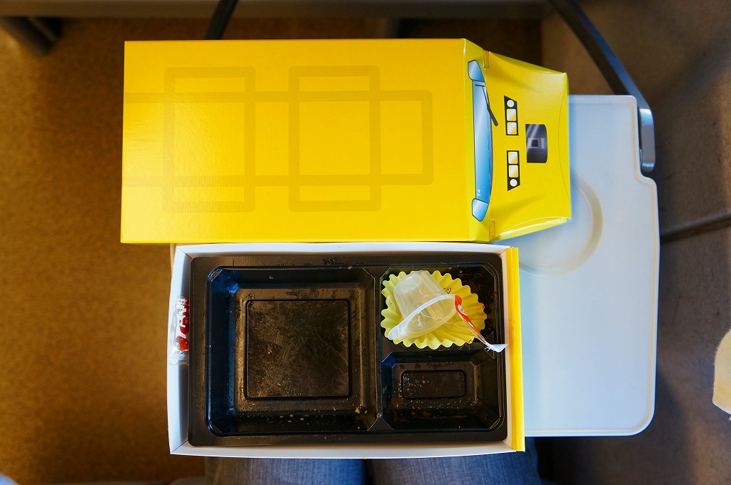 車両を模してはいるがずいぶん平べったいボール紙製容器の、引き出しに収まる黒いプラ製トレーに、たっぷりのオムライス、ウインナー、ハンバーグ、フライドポテト、エビ焼売、スパゲティ、ブロッコリー、みかんゼリー、福神漬などを詰める。つまり、中身は一部を除きお子様ランチ。割り箸とプラ製スプーンの双方を添付し、親子で一緒に車内で食べられる。駅での販売は2013年に終わり、以後は名古屋市の「リニア・鉄道館」の館内弁当として売られている模様。