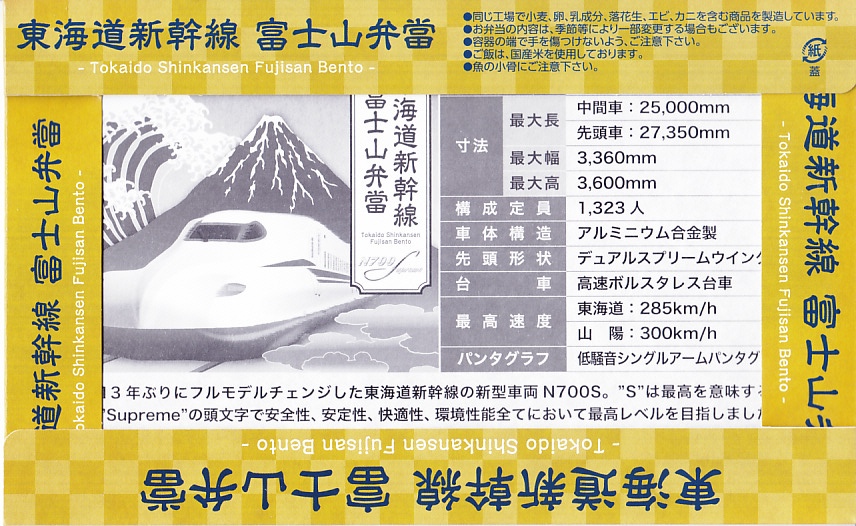 2024(令和6)年10月15日に、東海道新幹線の東京駅とリニア・鉄道館で発売。12日から14日まで静岡駅ビルで先行販売。ここでは新横浜駅で買えたため、この調製元の弁当なので東京駅から新大阪駅までの主要駅でも売り始めたはず。富士山と新幹線で定番の風景写真を印刷した、いわゆるタッパー、プラスチック製密封容器を、商品名や新幹線車体柄などを記したスリーブにはめる。