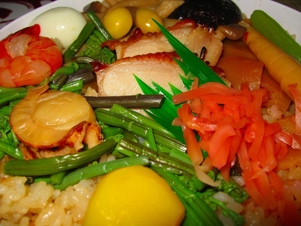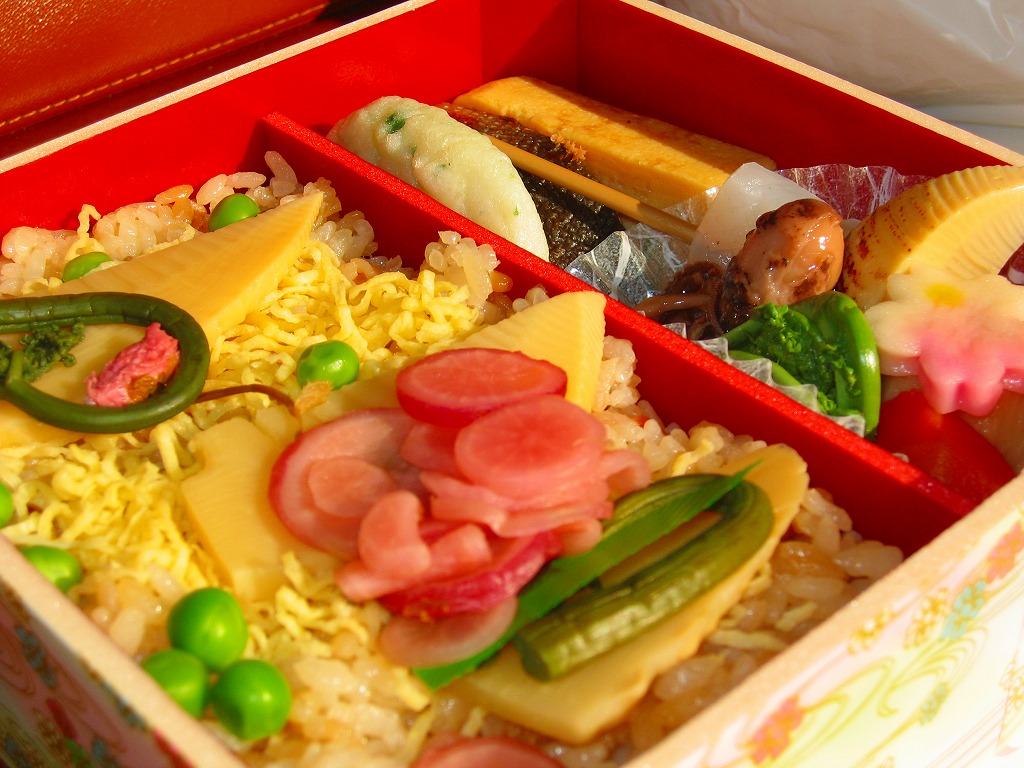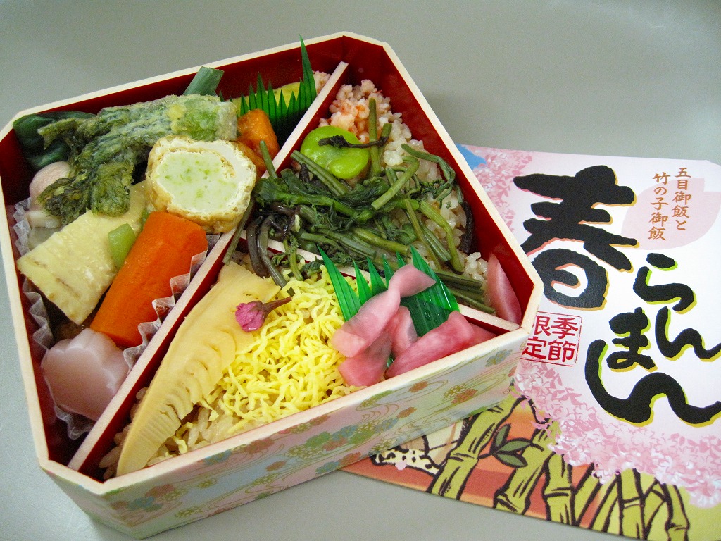 2009(平成21)年春の季節弁当で、おそらく東京・品川・新横浜・名古屋・京都・新大阪の各駅と東海道新幹線車内で販売。弁当名のとおり、正方形の容器を対角線で仕切った中身の1/4が山菜の載る五目御飯、1/4がタケノコや桜花の載る竹の子御飯、残りがおかずで鮭塩焼、笹巻麩、薩摩揚、肉団子、サトイモやニンジンなどの煮物、タラの芽の天ぷらなど。