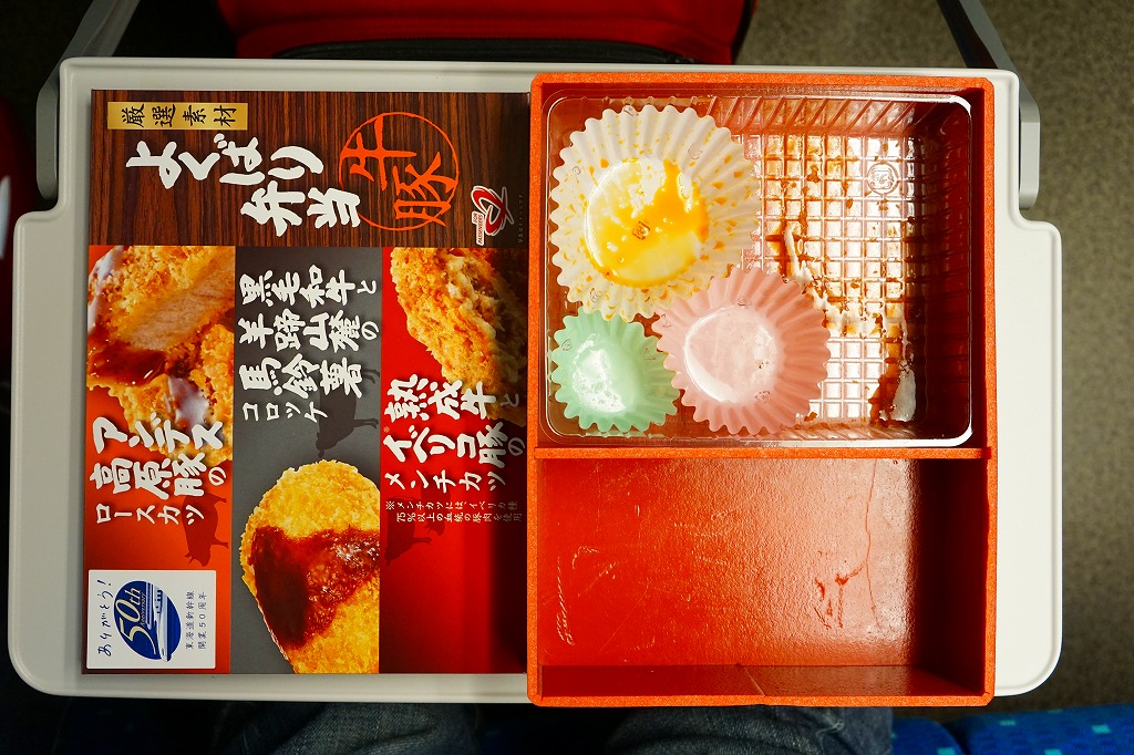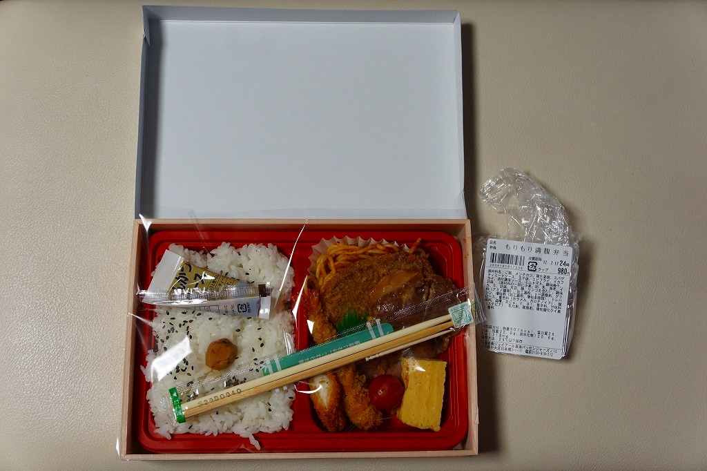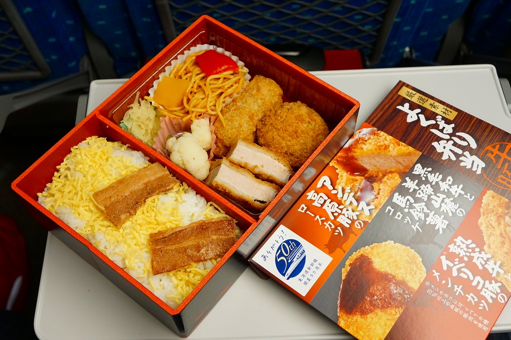 2014(平成26)年の春までに東京・品川・新横浜・名古屋・京都・新大阪の各駅で発売か。白飯には錦糸卵と豚蒲焼2枚を載せ、おかずはロースカツ2切れ、メンチカツ1個、コロッケ1個、スパゲティ、カリフラワーとブロッコリー、パプリカ2枚、キャベツ酢漬け。パッケージの表面と裏面にあるとおり、ロースカツにはアンデス高原豚、メンチカツには熟成牛とイベリコ豚、コロッケには黒毛和牛と羊蹄山麓馬鈴薯が使われるという。朝飯にして失敗した、揚げ物だらけのがっつり駅弁。2016年までの販売か。