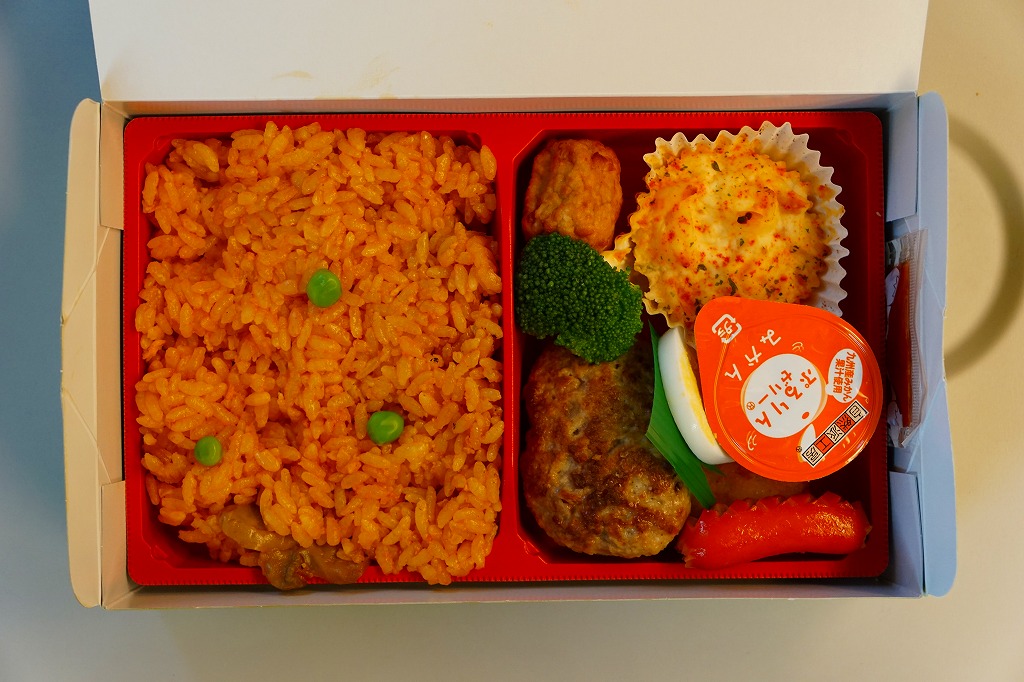 子供向け商品のデザインを持つボール紙箱に入れた赤いプラ製トレーの半分がマッシュルーム入りチキンライス、半分がマカロニグラタン、ハンバーグ、鶏つくね揚、ポテトフライ、ウインナー、ブロッコリー、ゆで卵、みかんゼリー。中身の具材とパッケージの絵柄が合うのはJRCPの十八番。子供向け駅弁、お子様ランチ駅弁にありがちな冷凍食品感がなく、食感も風味もまともで、価格もたった620円と安く、これはなかなかの実力派。