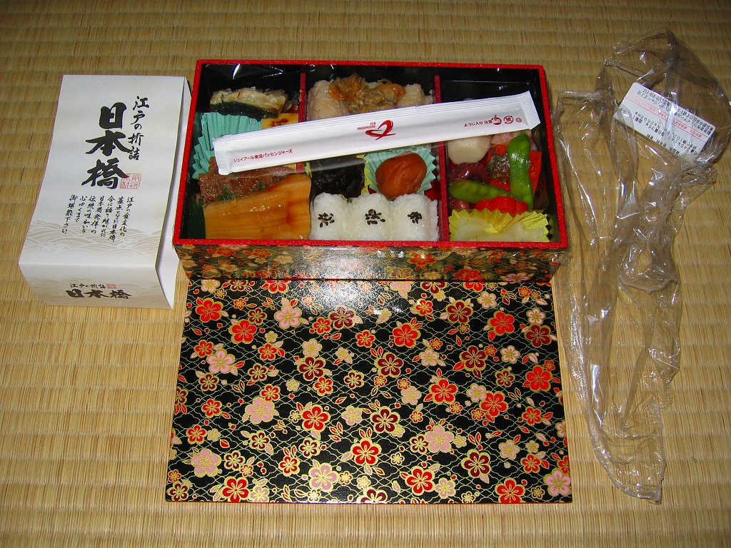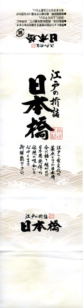 下記の駅弁「特製幕の内弁当 日本橋」の、2006(平成18)年時点での姿だと思われる。広さと深さがある豪華絢爛な柄の容器に、商品名その他最小限の文字だけ書いた掛紙を巻き、ラップで包んで食品表示ラベルを貼る。掛紙と食品表示ラベルで商品名が異なるが、ここでは掛紙に従った。