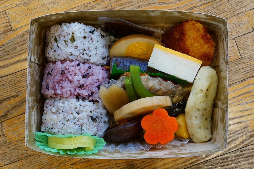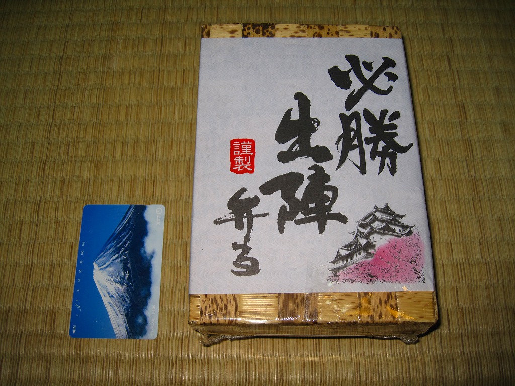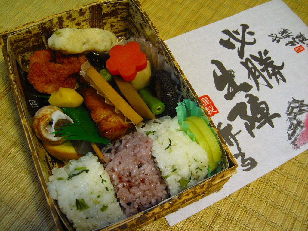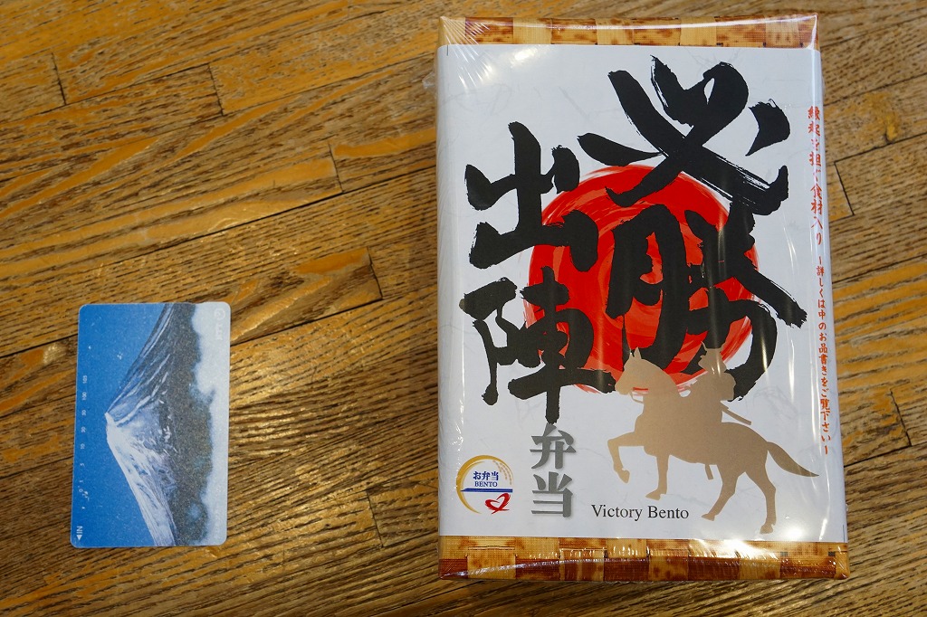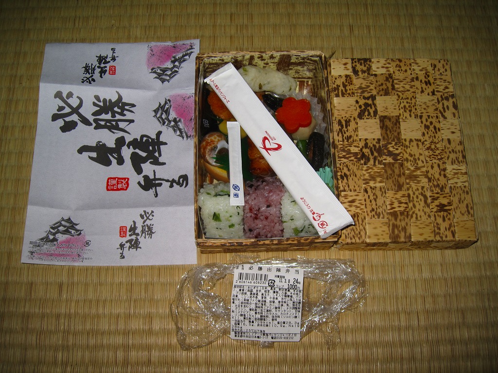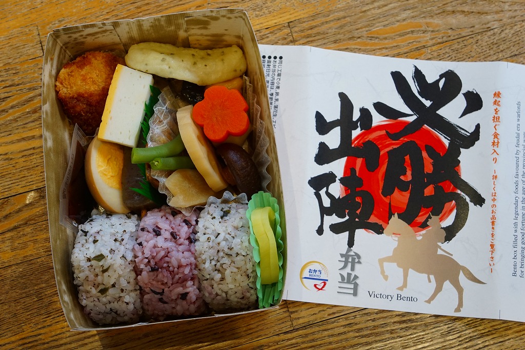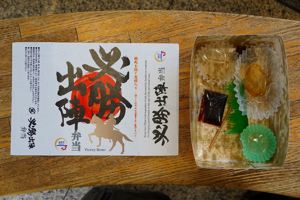 竹皮編み柄のボール紙製容器に、駅弁の名前や日の丸などを力強く描いた掛紙をかける。中身はしそわかめ2個と黒米1個のおにぎりに、ブリ照焼、味噌田楽、薩摩揚、みそかつ、味付玉子、黄金焼きのしいか、野菜の炊き合わせ、栗甘露煮、昆布巻、漬物。必勝や出陣ということで、縁起を担ぐ食材を取り入れたそうな。2011(平成23)年1月に「必勝出陣弁当」へ改称。価格は2017年の購入時で1,050円。2018(平成30)年限りで終売か。2021(令和3)年8月2日に980円で再発売、価格は2022年時点で1,000円。2022年までの販売か。