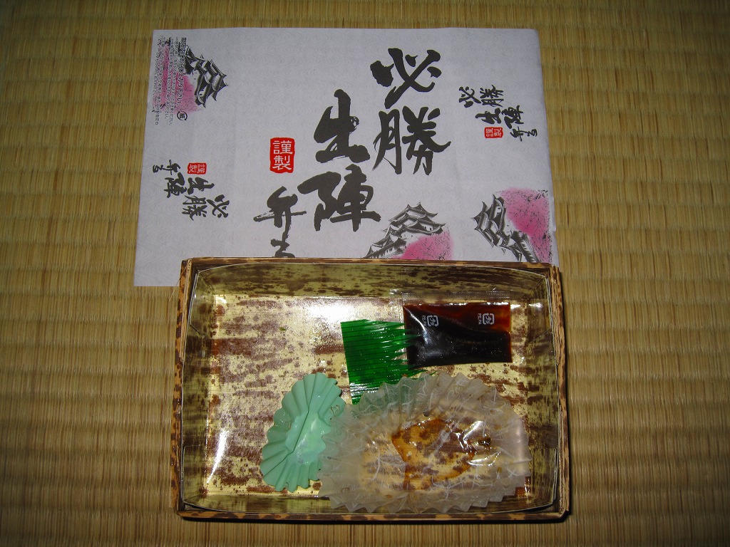 上記の駅弁「必勝出陣弁当」の、2003年時点での姿で、発売当時の姿。掛紙は駅弁の名前を墨字で描き、謹製の判とコンテストの名前を記すだけのシンプルな絵柄だった。中身は握り飯が3個にブリ照焼、とこぶし、味噌田楽、鶏唐揚、栗甘露煮など。お手拭きと楊枝も同封した幅広な箸袋に、光沢紙使用のお品書きも入る。「トコブシ」「栗」「昆布巻き」は出陣にちなんだという。