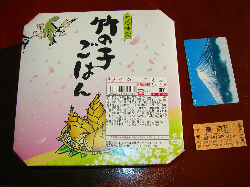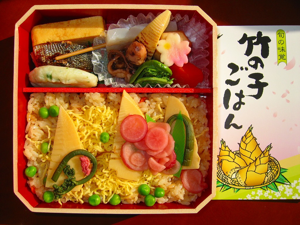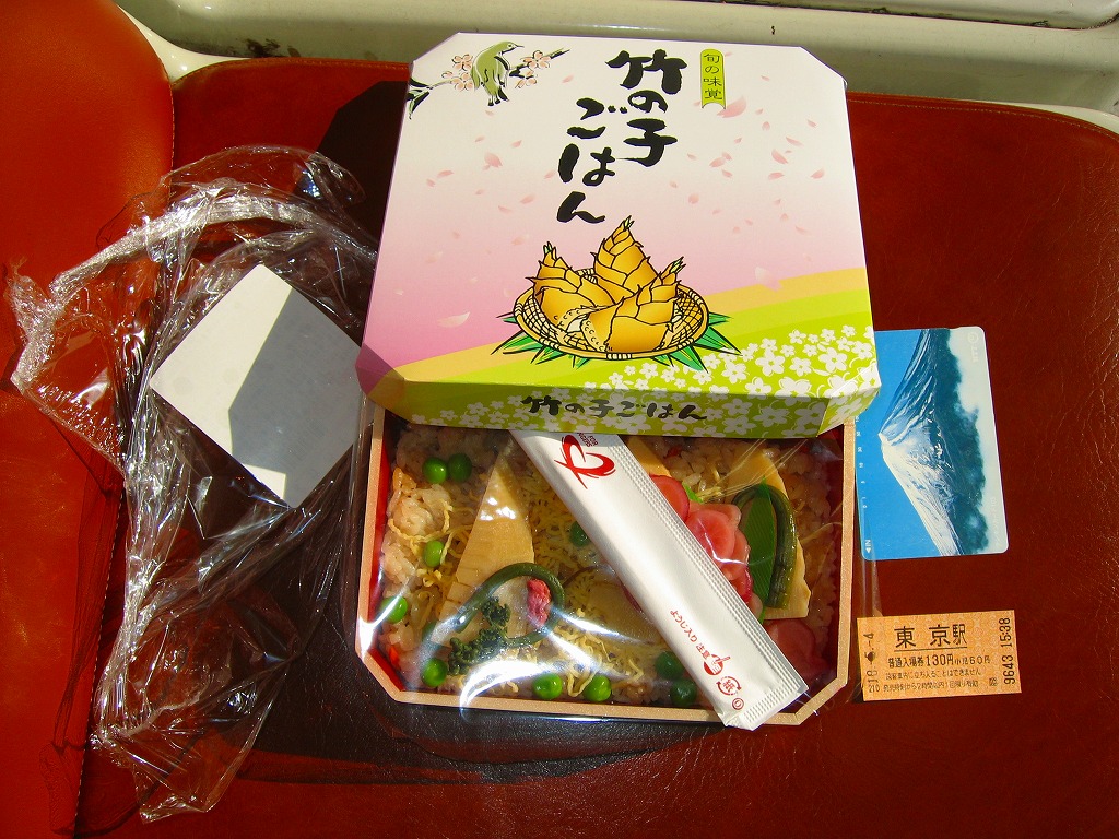 東海道新幹線の東京・品川・新横浜の各駅で販売された、2006年春の季節駅弁。ほぼ正方形の容器に、タケノコとウグイスなどを描いたボール紙のふたをして、ラップで包み食品表示ラベルを貼る。中身はタケノコと大根桜漬けと錦糸卵とゼンマイとグリーンピースが載るタケノコ御飯に、玉子焼、マス西京焼、イイダコ、白い薩摩揚、串こんにゃく、里芋など。