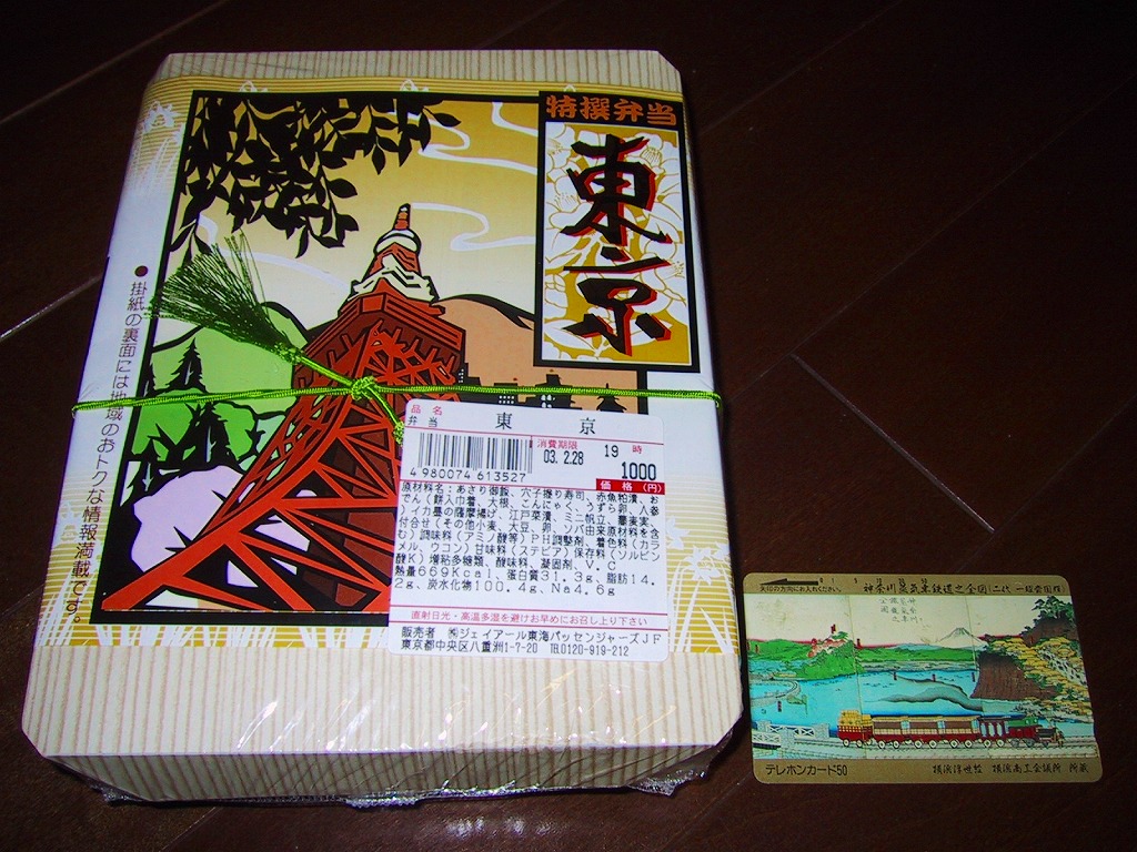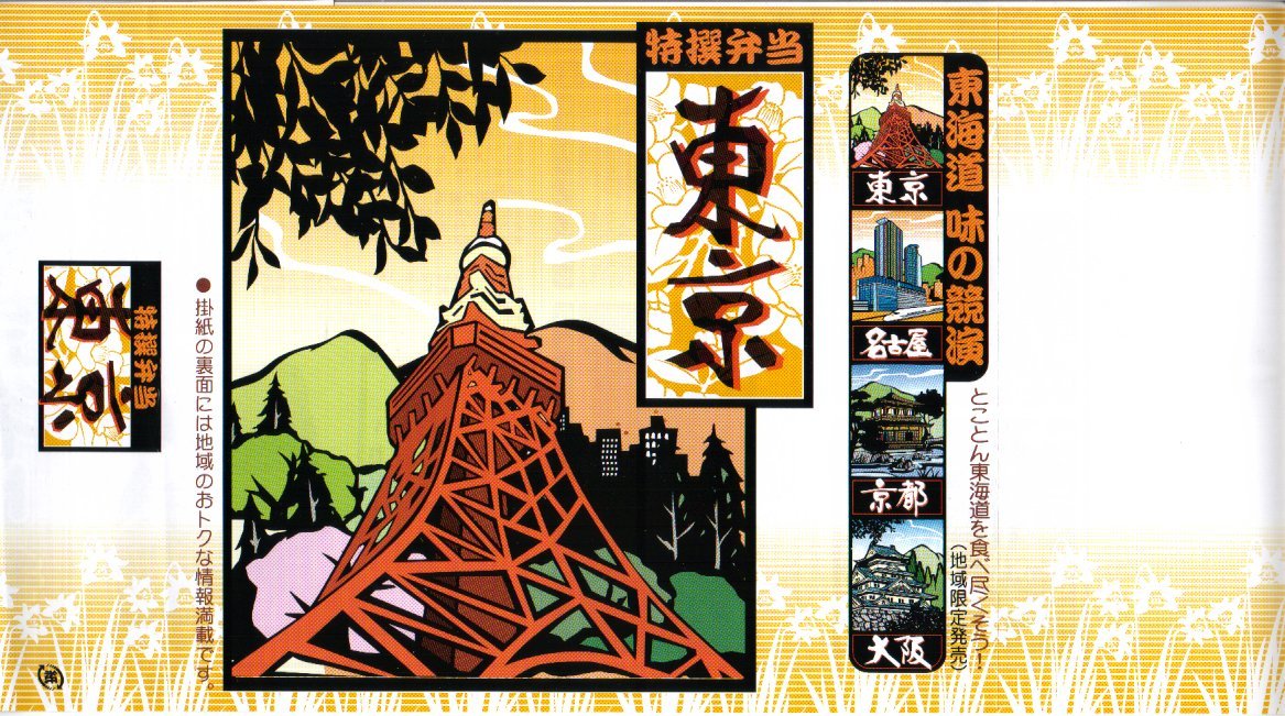 2002(平成14)年の秋に発売。東京・名古屋・京都・新大阪と用意された新幹線駅構内限定弁当の東京駅版。東京タワーを描いた掛紙は脇に他3駅の掛紙画のサムネイル付き、裏面には中身の解説や半年分の東京イベントカレンダーが印刷される。中身はあさり御飯、穴子握り寿司、赤魚粕漬や帆立酒蒸など、おでんが4区画それぞれに入っている。