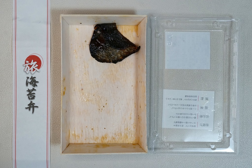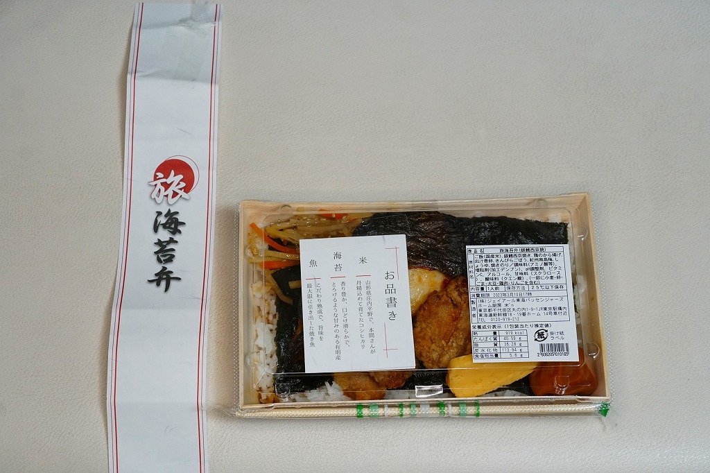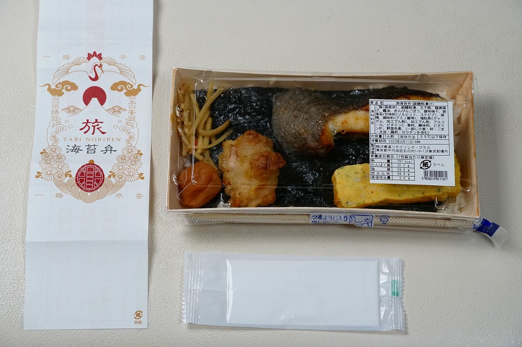 2025年4月に東海道新幹線の18・19番ホーム上で買えた旅海苔弁。訪問時は10種類のおにぎりの他に、同じ容器と紙帯を共有する弁当「銀鮭塩焼き」(1,280円)「銀鱈粕漬け」(1,300円)が新商品として売られていた。これは「銀鱈粕漬け」のほうで、食品表示ラベルにそう書いてある。木質エコ容器に白飯を詰め、海苔を貼り、銀だら粕漬け、玉子焼、鶏唐揚げ、きんぴらごぼう、梅干しを載せる。2023年の開店時に売られた「旅海苔弁」の現況なのだろう、ほどよい分量の高級海苔弁。