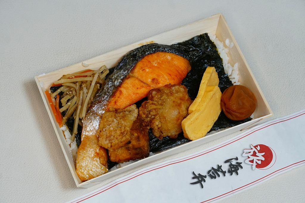 これは「銀鮭塩焼」。長方形の平たい木質エコ容器に、庄内米コシヒカリの白飯を敷き、有明海産の焼き海苔を貼り、塩銀鮭切り身、鶏のから揚げ、出汁巻卵、ラー油でピリ辛のきんぴらごぼう、紀州南高梅を盛り付ける。近年の東京でいくつか出てきている、本格志向の高級海苔弁当。簡単なお品書きを付け、商品名を書いた紙帯を締め、店内で調製し暖かい状態で売られる。世の鶏卵不足により2023年4月10日から6月20日まで、出汁巻玉子を抜いて30円引きで販売。2025年時点でこの姿では現存しない模様。