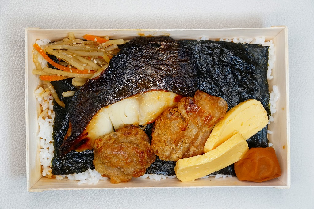 これは「銀鱈西京焼」。長方形の平たい木質エコ容器に、庄内米コシヒカリの白飯を敷き、有明海産の焼き海苔を貼り、銀鱈西京焼き、鶏のから揚げ、出汁巻卵、ラー油でピリ辛のきんぴらごぼう、紀州南高梅を盛り付ける。近年の東京でいくつか出てきている、本格志向の高級海苔弁当。簡単なお品書きを付け、商品名を書いた紙帯を締め、店内で調製し暖かい状態で売られる。世の鶏卵不足により2023年4月10日から6月20日まで、出汁巻玉子を抜いて30円引きで販売。2025年時点でこの姿では現存しない模様。