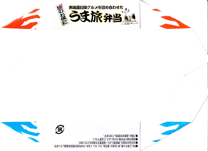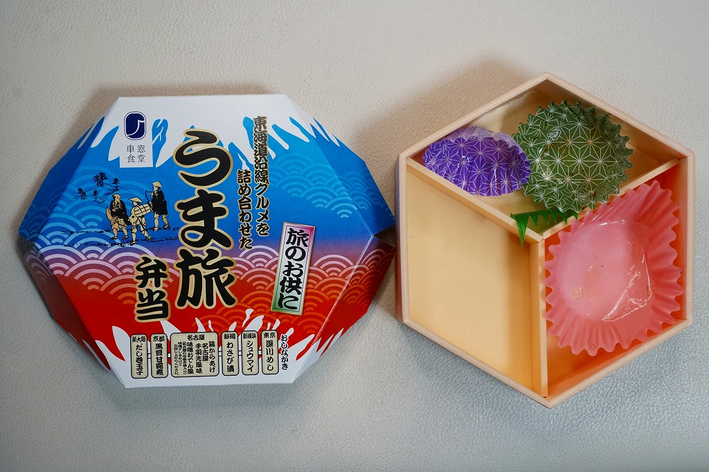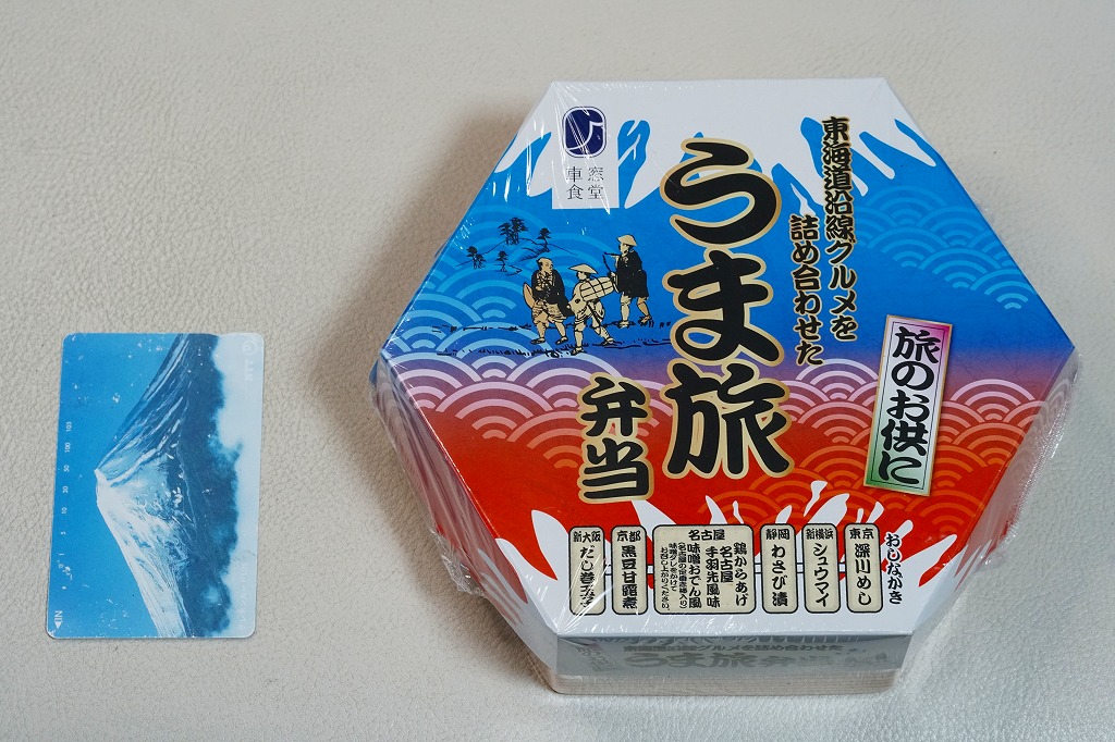 2024(令和6)年12月に東京、品川、新横浜、名古屋、京都、新大阪の東海道新幹線各駅で発売。今まで十数回以上は出ていると思う、今回は「東海道沿線グルメを詰め合わせた」タイプの東海道新幹線弁当。富士山と赤富士と江戸時代の旅の光景を描いたふたをかける、3区画に区切られた正六角形の容器に、東京の深川めし、新横浜のシュウマイ、静岡のわさび漬、名古屋の鶏からあげ名古屋手羽先風味と味噌おでん風、京都の黒豆甘露煮、新大阪のだし巻玉子、かまぼこと柴漬けを詰めた。2025年2月4日から24日までは、猫の日にちなみふたの絵柄を変えた「うにゃあ旅弁当」として販売。