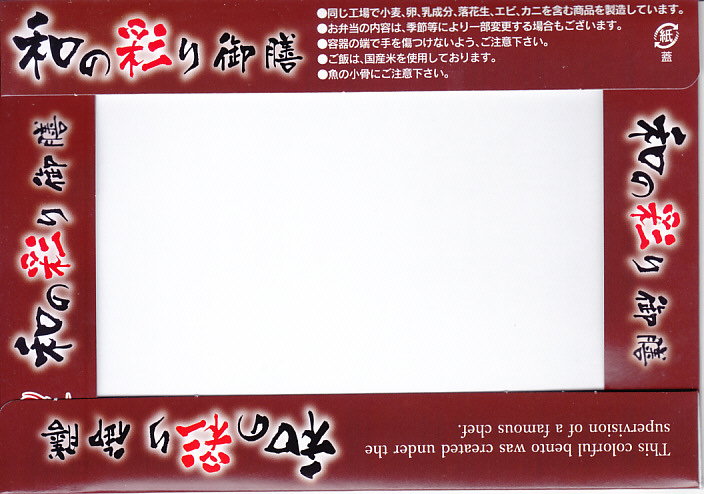 これは廉価版の幕の内駅弁なのだろうか、駅弁としては大きめな、JRCPでは標準サイズの専用紙箱に入った黒いトレーの中に、とりそぼろと錦糸卵と鶏照焼を載せた白御飯、エビフライ、玉子焼、鮭塩焼、しゅうまい、シイタケやゴボウなどの煮物、シラタキ白和え、漬物などを詰める。同社の千円以上の駅弁とあまり変わらない分量と内容だと思う。現存しない模様。