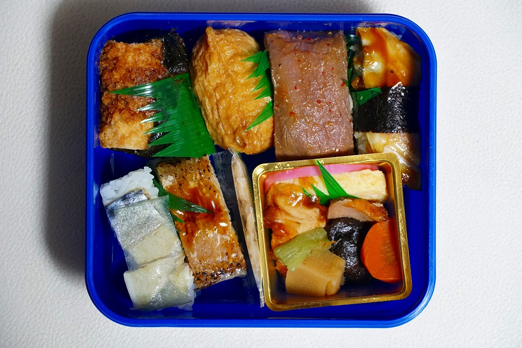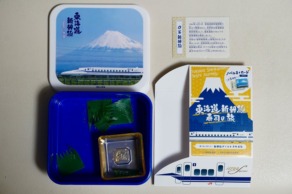 中身は、東京イメージの穴子寿司、横浜イメージの赤レンガローストビーフ寿司、静岡イメージのわさび風味いなり、名古屋イメージの味噌カツ寿司、京都イメージのはも寿司、大阪イメージのバッテラで6個の寿司を並べ、鶏照焼、玉子焼、かまぼこ、煮物、ガリを添えるもの。容器そのものは「はろうきてぃ柿の葉寿司」などと同じで、今後も新幹線でこのような商品を出し続けるのだろう。