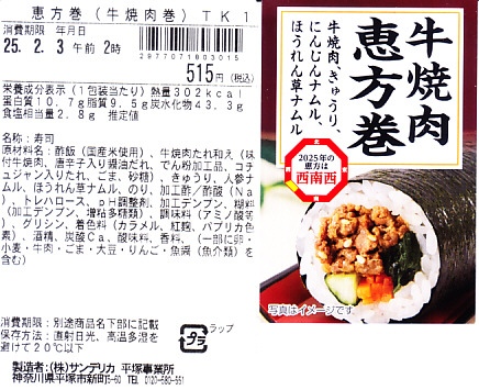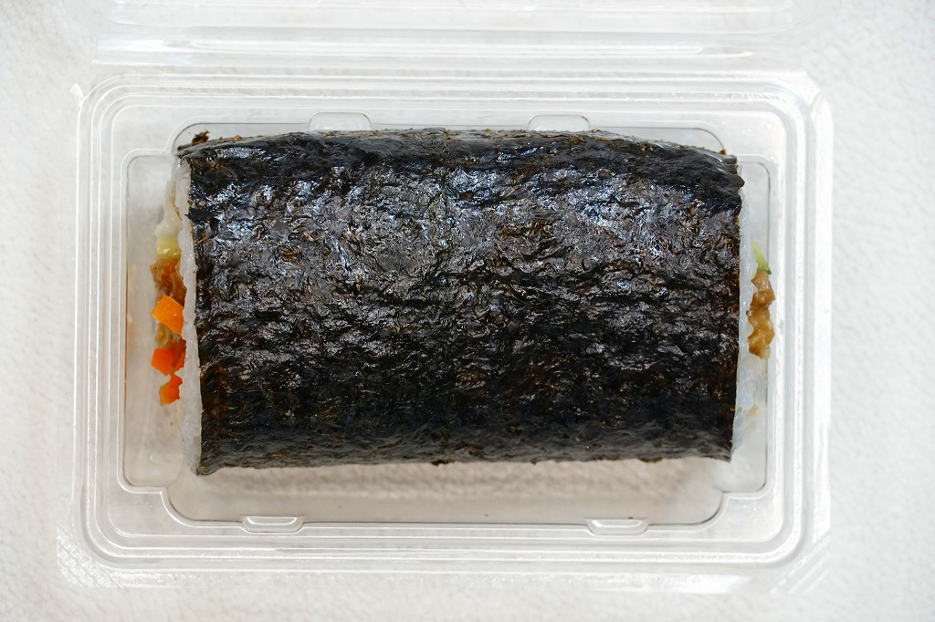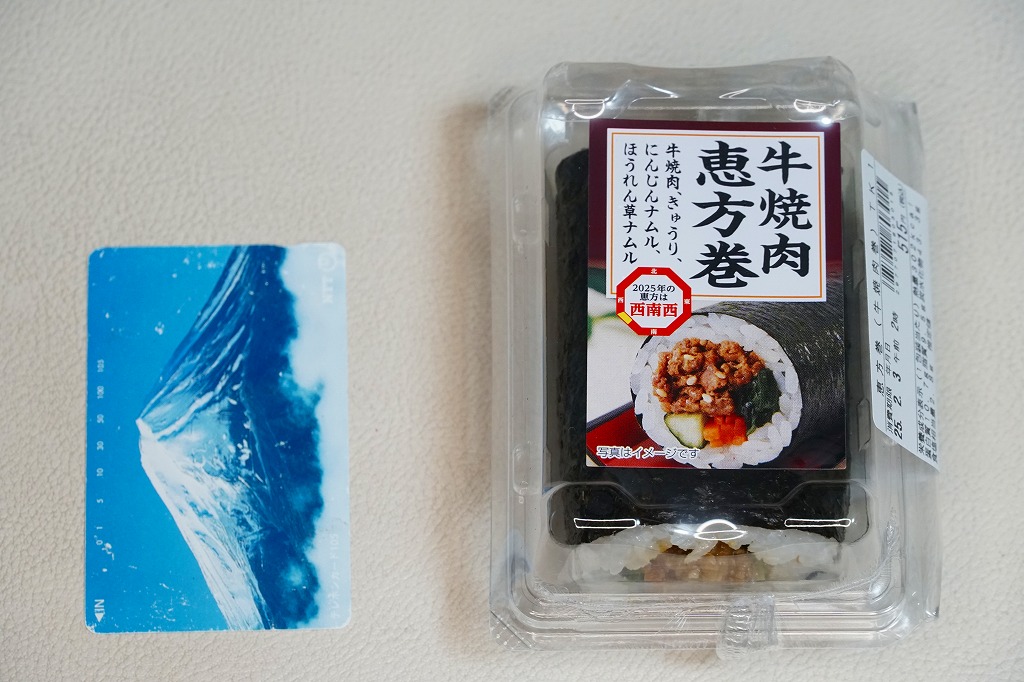 2025(令和7)年の節分の日に買えた恵方巻。東海道新幹線の駅弁売店では例年、もっと大きく高価な恵方巻が売られたと思うが、この年に買えたのはこれだけだった。透明なプラ容器に、コンビニおにぎり程度の分量である小さな太巻きを1個入れ、ラップを巻いて商品名と食品表示のラベルを貼る。牛焼肉、きゅうり、にんじんナムル、ほうれん草ナムルを酢飯と海苔で巻いた、韓国風焼肉海苔巻。駅弁にはとても見えない、スーパーの惣菜。