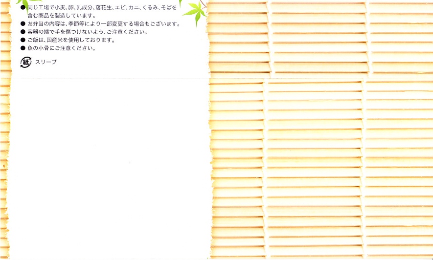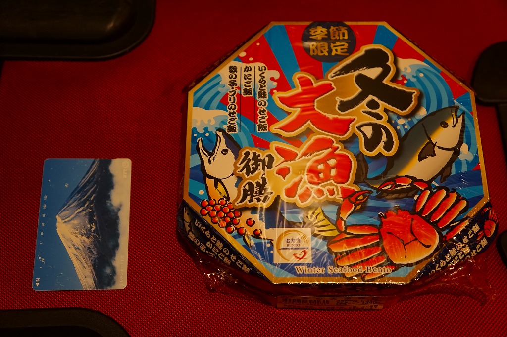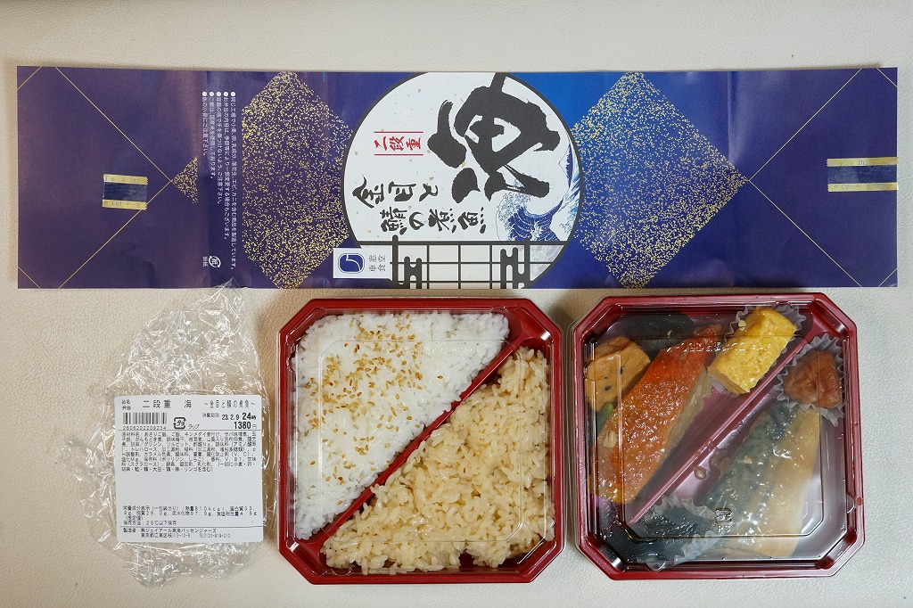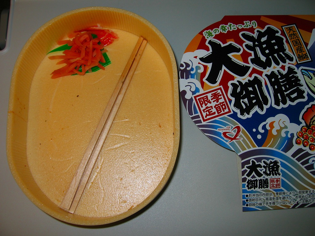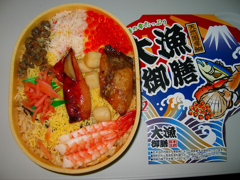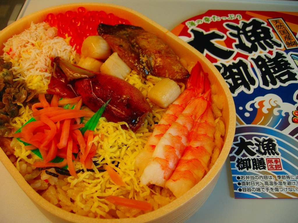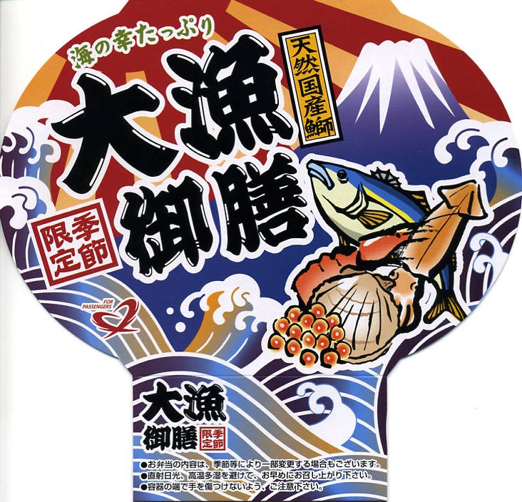 どちらかといえば夕食向け。見た目こそ具の節約で余ったすき間を紅生姜や錦糸卵で隠しているようだが、中身はしっかり詰まり、飯に対する具の分量は適切で、味もまあ良い。パッケージの食材のイラストと中身の一致は、JRCPのお家芸であるような。2010年度版から「冬の大漁御膳」と名を変え、同じ名前と違う中身で、以後も毎冬に出た模様。2016年までの販売か。