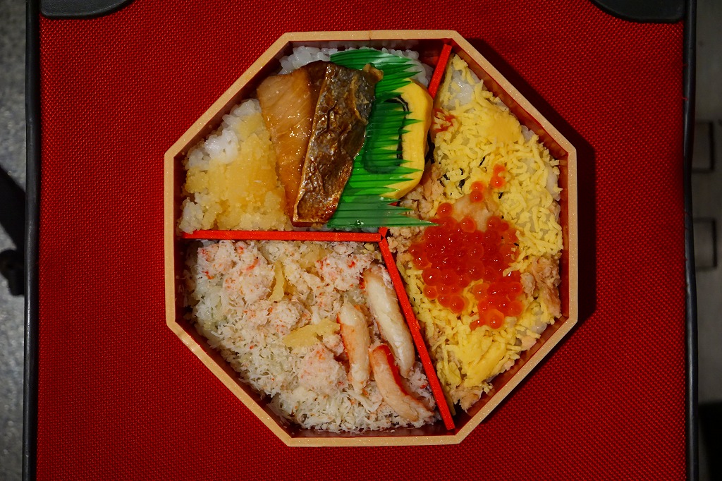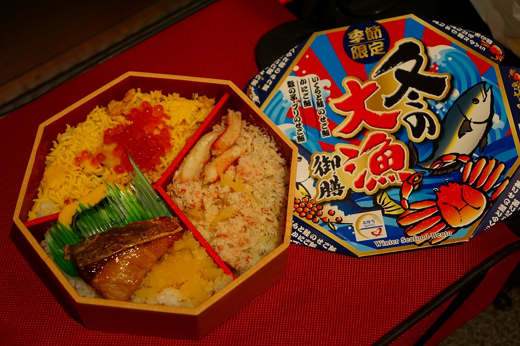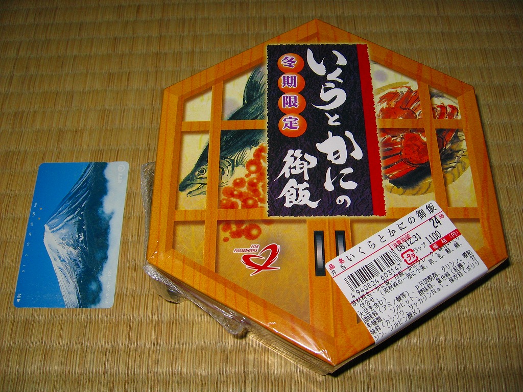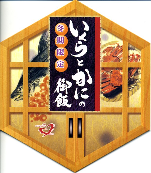 2006年12月1日から2007年2月28日まで、各駅と車内で販売された季節限定弁当。正六角形の容器に商品名を描いたボール紙のふたをはめて、ラップで包んで食品表示ラベルを貼る。中身はカニほぐし身にグリーンピースと刻み椎茸を添えた御飯と、イクラに錦糸卵と鮭フレークや錦糸卵やガリを詰めた御飯で半分ずつ。