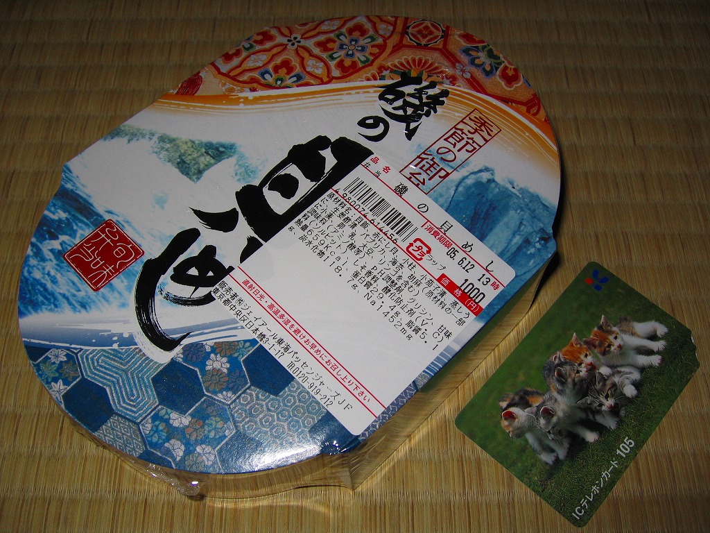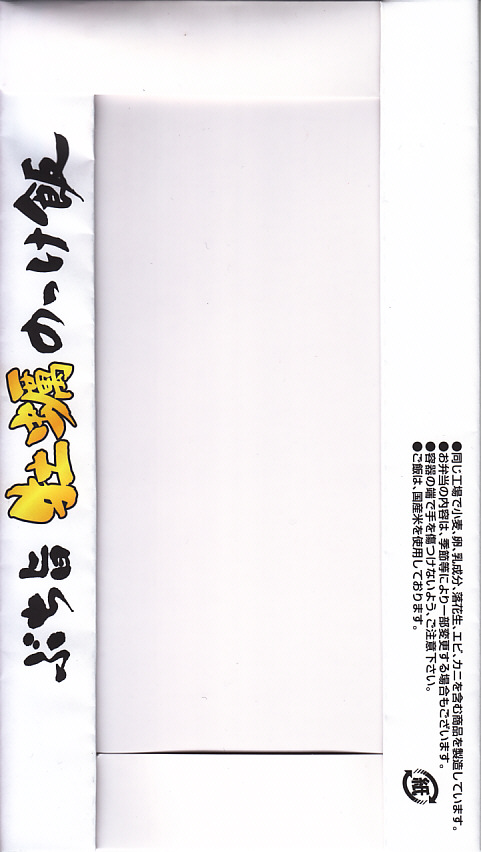 2007(平成19)年に冬季限定弁当で発売か。今回の2008年度版は、楕円形状の容器に透明なふたをして、同一形状で賑やかな絵柄のボール紙の枠にはめ、ラップに包んで食品表示ラベルを貼る。中身は炊込飯の上にブリ照焼、イカ照焼、貝柱、カニフレーク、ボイル海老、イクラ、シジミなどを載せるもの。