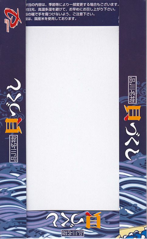 2013(平成25)年2月15日に購入した、品川駅弁のふた。上記の2020年のものとほぼ変わらず、発売当時からもほぼ変わらない。変化は英文表記と調製元のロゴマークくらい。