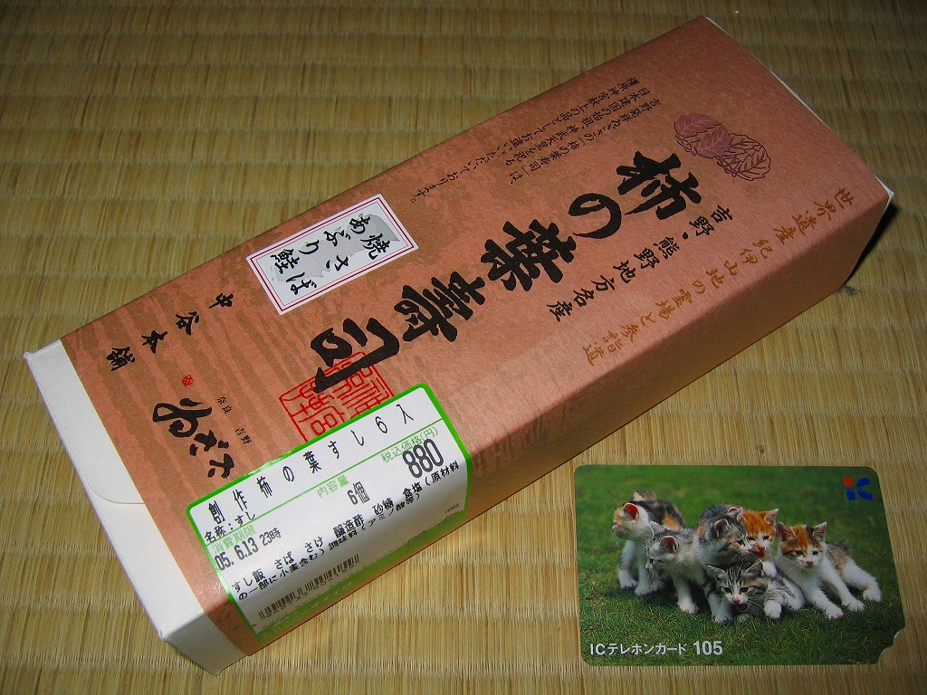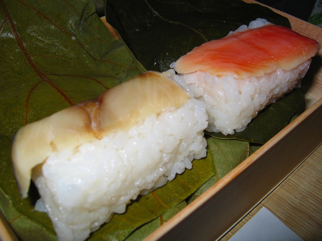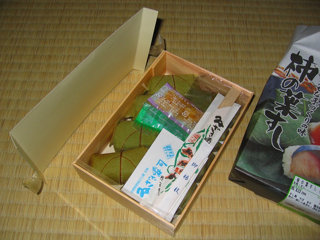 おそらく東京や新横浜など東海道新幹線の主要駅で販売されると思われる、JRCP扱いの柿の葉寿司。経木枠の長方形の容器にボール紙の木目蓋をかけて、中身の飾り付け例のカラー写真を載せた包装紙で包む。中身は商品名のとおり、サバとマスの柿の葉寿司。しかしずいぶんと塩辛かった。