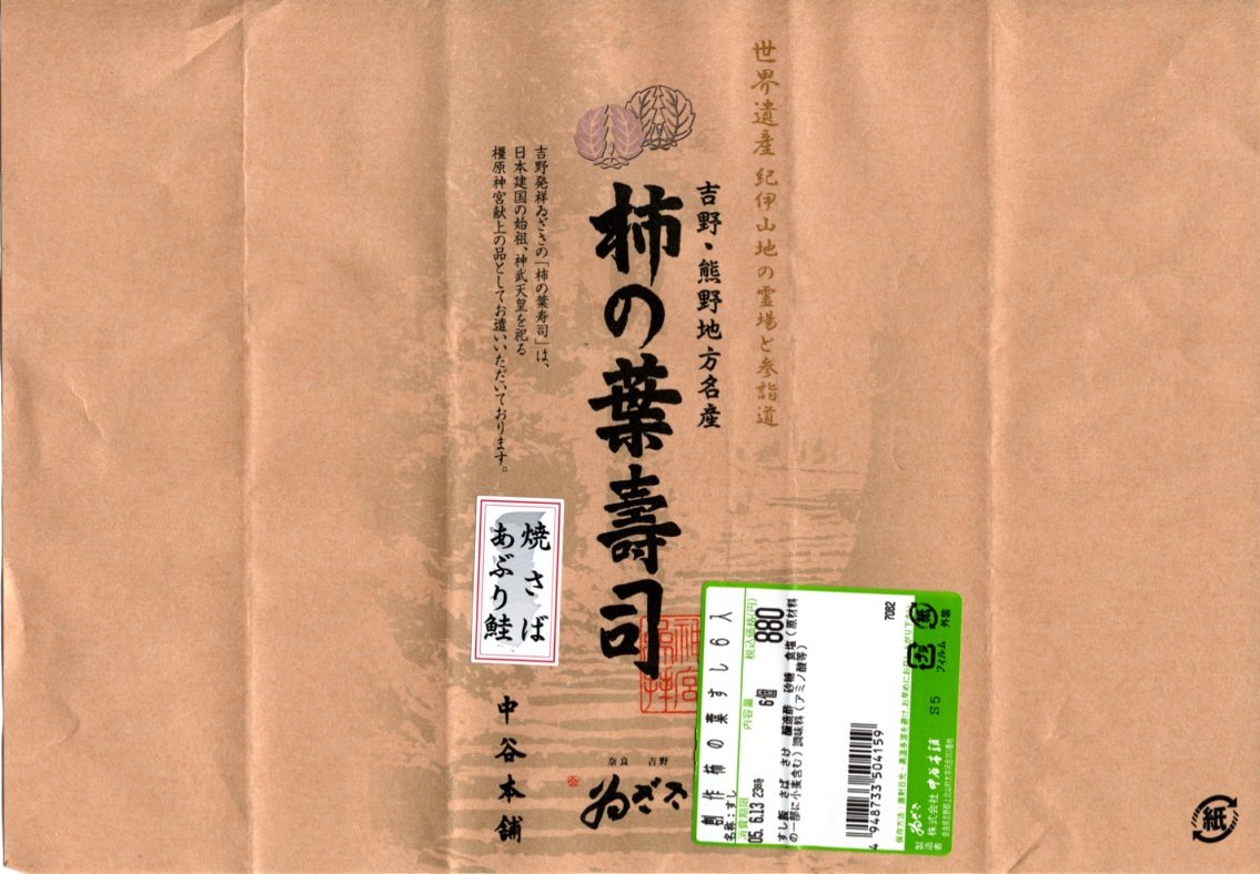 包装紙記載の製造元は、全国各地の百貨店に柿の葉寿司の店舗を構えたり、JR東海や近鉄の主要駅に商品を卸す、どちらかといえば地元密着より遠隔地展開タイプの柿の葉寿司屋さんか。スーパーの駅弁催事でも買ったことがあるが、なぜか会社名が異なる。