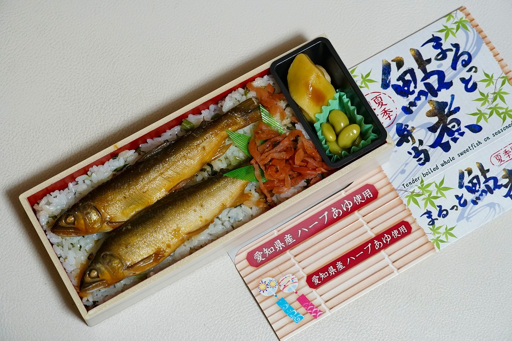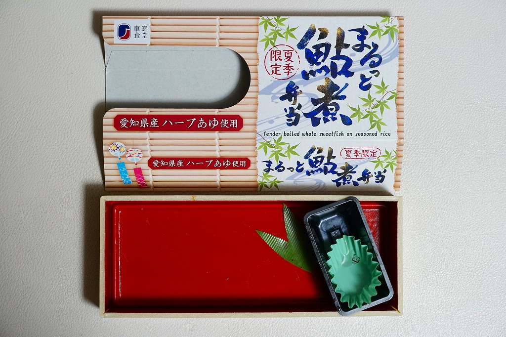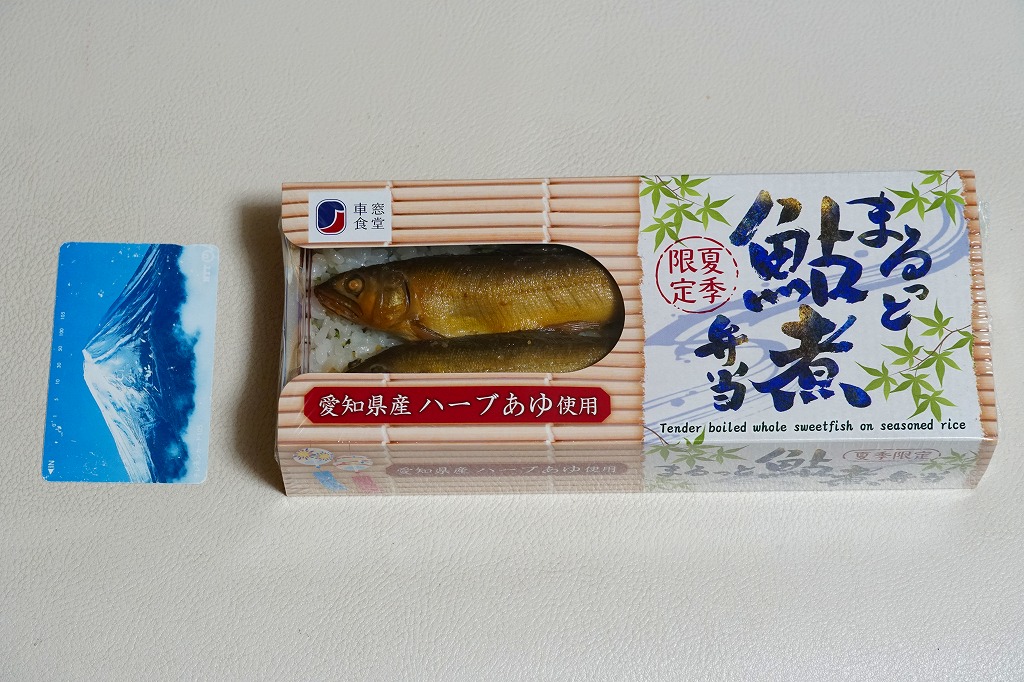 2024(令和6)年6月18日に東海道新幹線の東京、品川、新横浜、名古屋、京都、新大阪の各駅で発売された夏季限定駅弁。昭和時代や20世紀ならともかく、アユ駅弁の新作が出ることや、すしでないアユ駅弁、そもそもアユの駅弁が売られることが、とても珍しいことだと思う。しかも東京など大都会の駅で。細身の長方形のプラ容器を収めるスリーブには、まきすのような模様を描く。