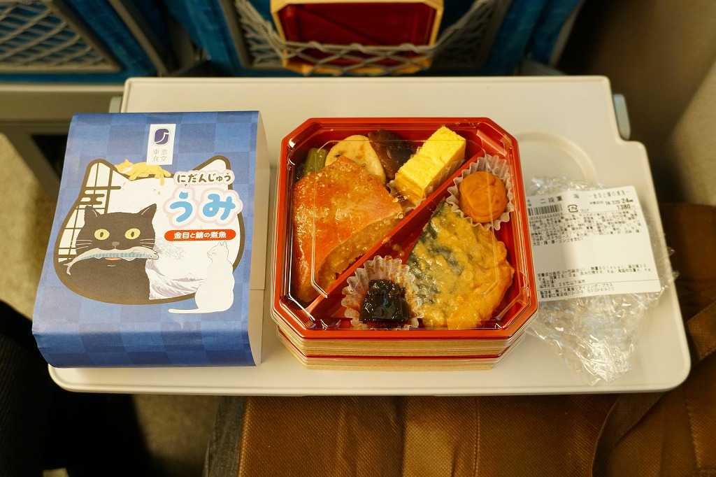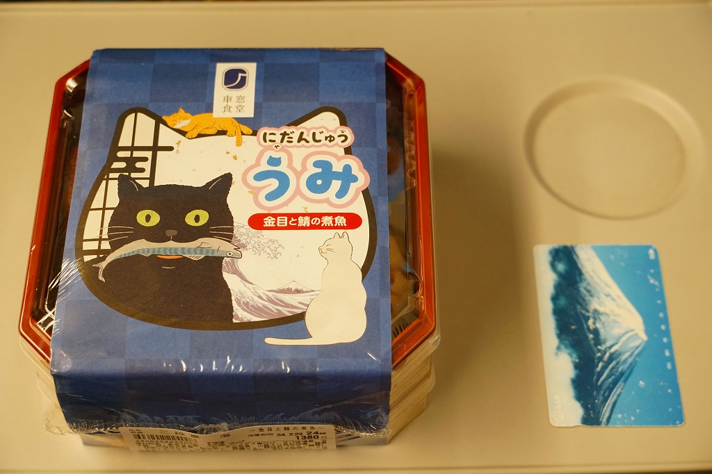 2024(令和6)年2月23日に購入した、東京駅弁の掛紙。調製元の「猫の日フェア」として、2024年2月6日から26日まで、既存の駅弁「二段重海金目と鯖の煮魚」の掛紙を、ネコのイラストに差し替えて販売した。中身と容器と値段は同じ。