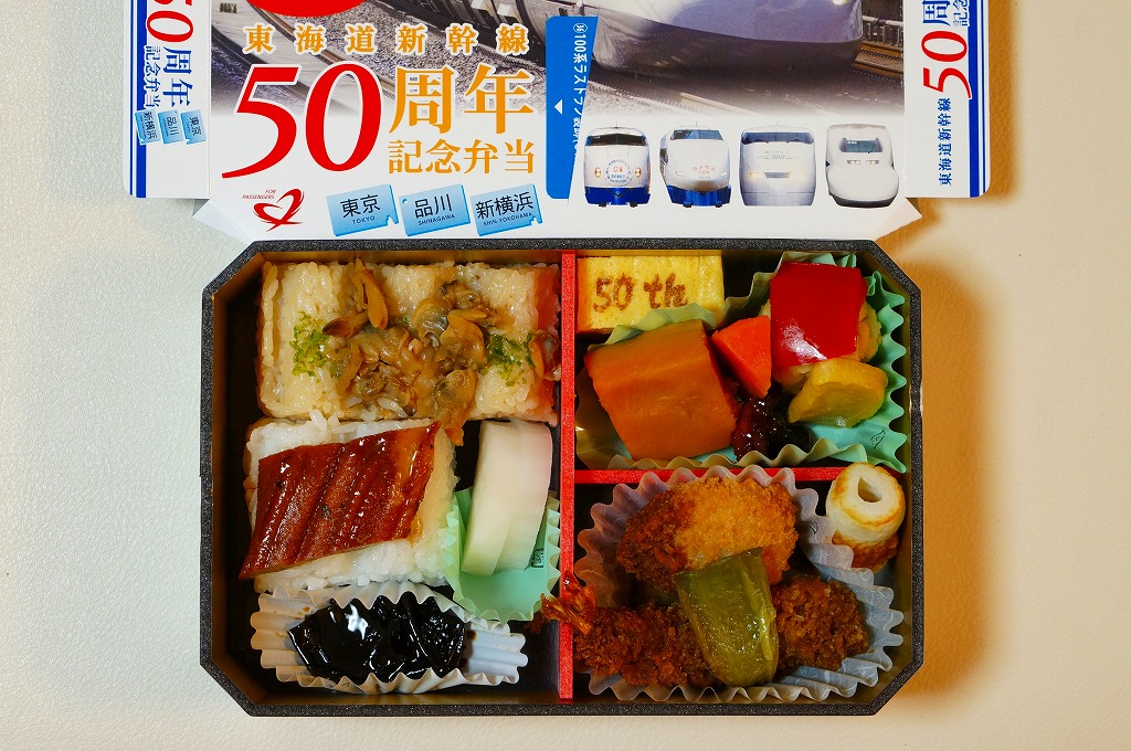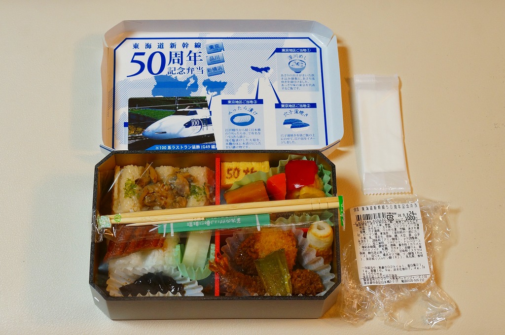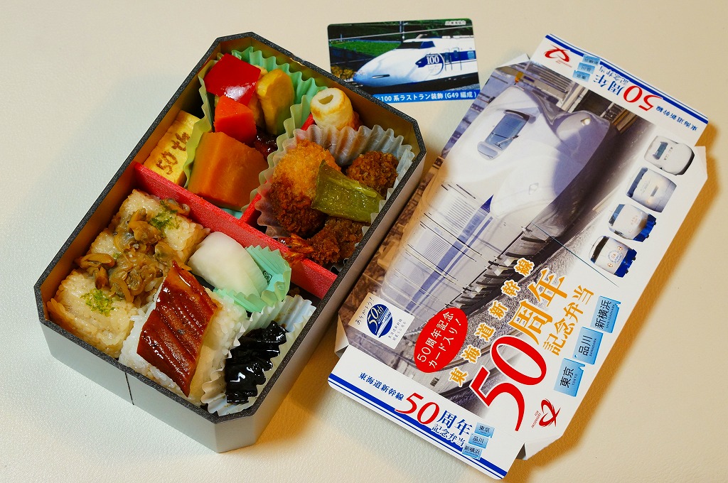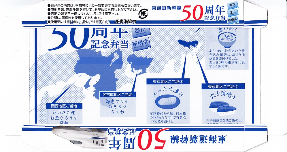 東海道新幹線の開業50周年を記念して、「東京・品川・新横浜」「名古屋」「京都・新大阪」の3種類を、2014(平成26)年4月1日から12月まで販売した記念駅弁。販売期間の前半と後半で異なるデザインのパッケージを使い、写真は後半版。さらに全50種類の中から1枚の記念カードを添付するという、東海道新幹線の駅弁では珍しく、コレクター仕様を取り入れている。