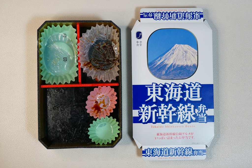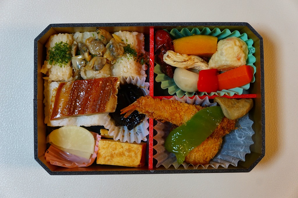 中身はあさりご飯に焼きアナゴ煮を載せ、煮物の数々と薩摩揚げ、味噌カツとエビフライ2本、玉子焼と海苔佃煮とたくあん。記念のふたを楽しむのもよし、ちょっと値上げした東名阪の駅弁を食事とするもよし。この第1期は9月24日から10月9日まで販売された。
