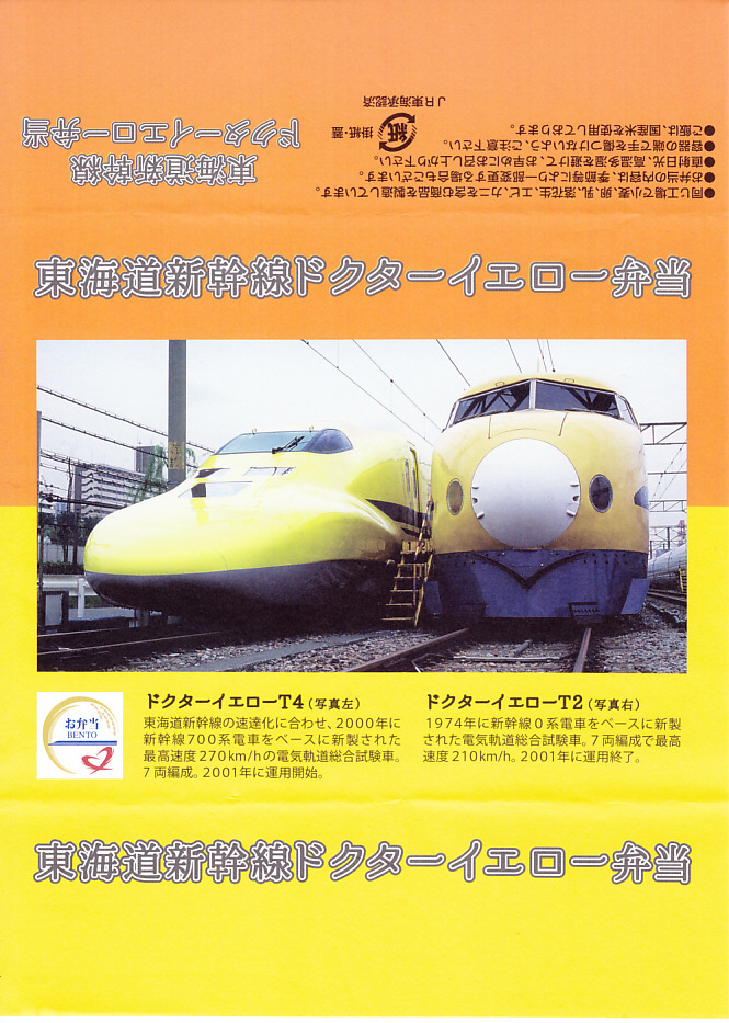 2016(平成28)年1月の京王百貨店の駅弁大会で、東京駅弁として売られたお弁当。掛紙は東海道新幹線の922形電気軌道総合試験車と923形電気軌道総合試験車、通称「ドクターイエロー」の並び写真を掲載、中身と価格は上記の駅弁「東海道新幹線弁当」と同じ。デパートの駅弁大会限定で売られたものだと考えられる。ボール紙のふたではなく掛紙の使用も、普段のJRCPの東海道新幹線の駅弁では考えられないもの。