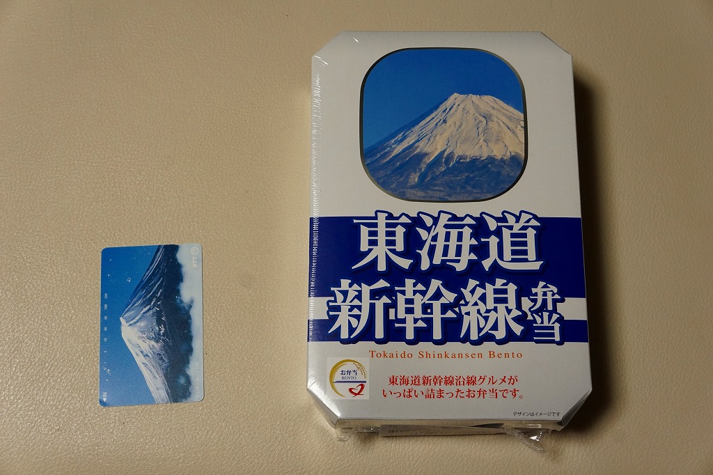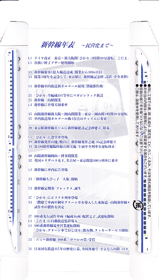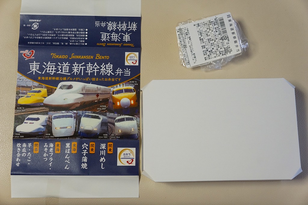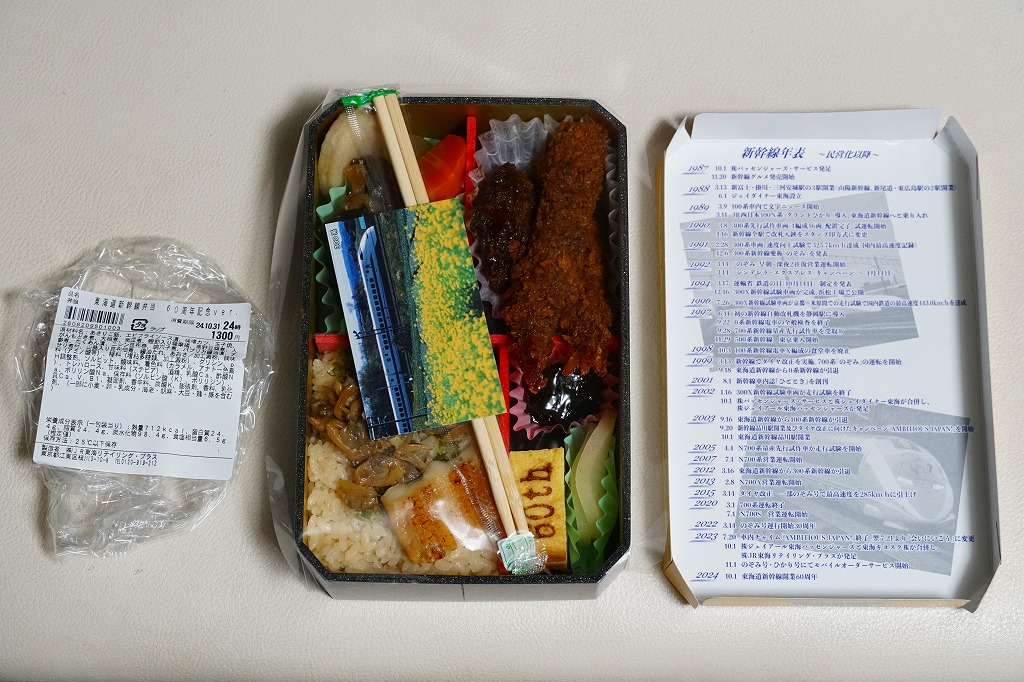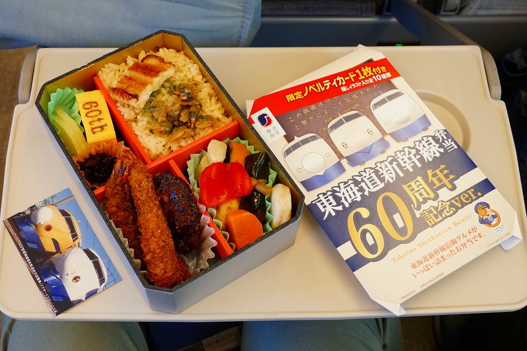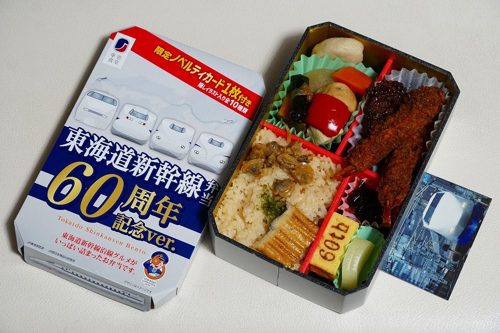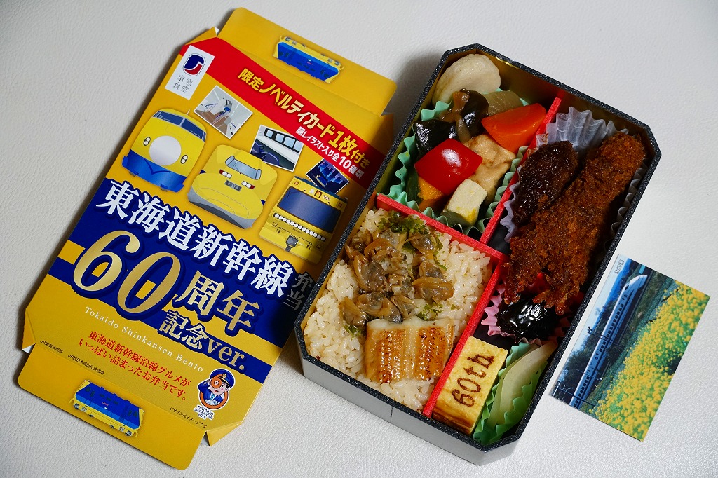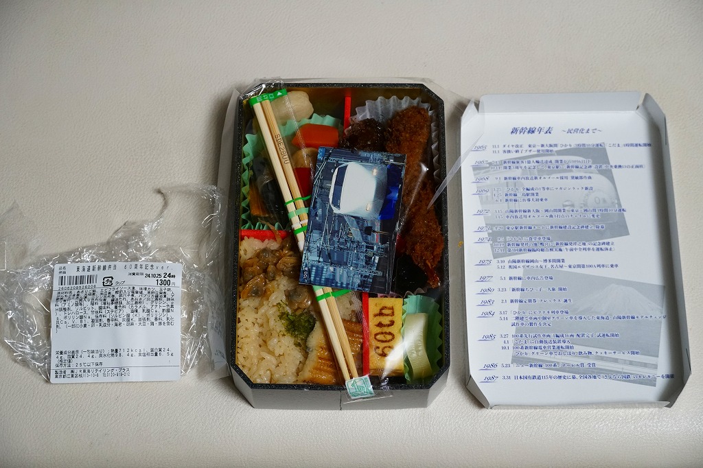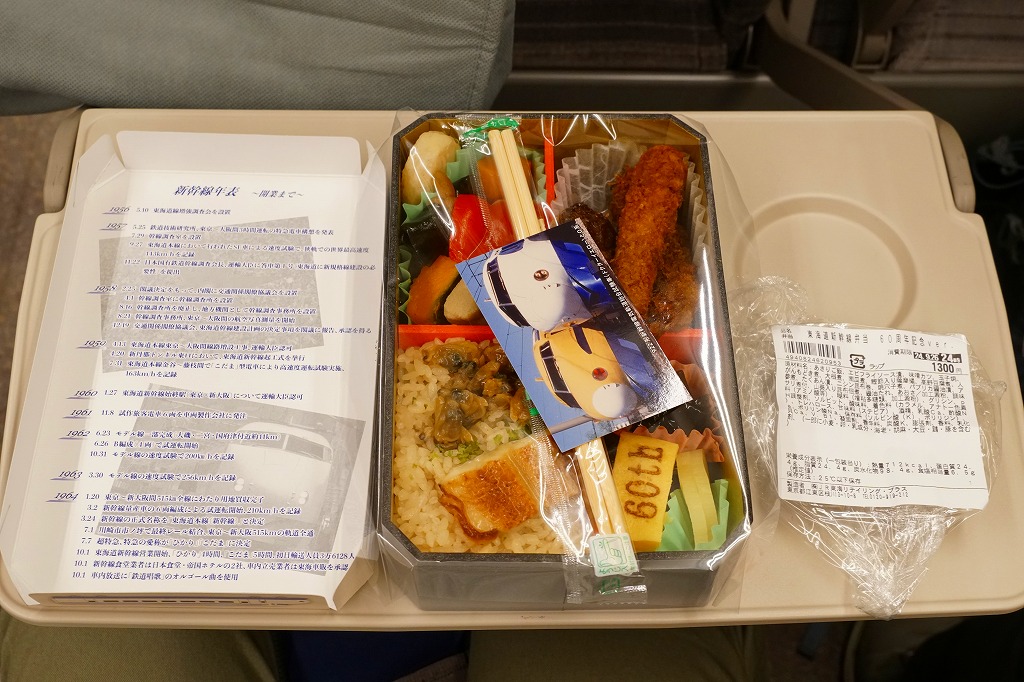 駅弁は普段の「東海道新幹線弁当」について、玉子焼に焼き印を入れ、エビフライを追加し、ノベルティカード全10種のうち1枚を添付し、パッケージ(ふた)を3期に分けて絵柄を変えて、価格を1,300円に上げて販売した。これはそのうち第1期。ふたの表面では東京駅のレリーフを背景に1000形と0系と100系の新幹線電車イラストを並べ、裏面には1956年から1964年までの東海道新幹線の年表を載せた。