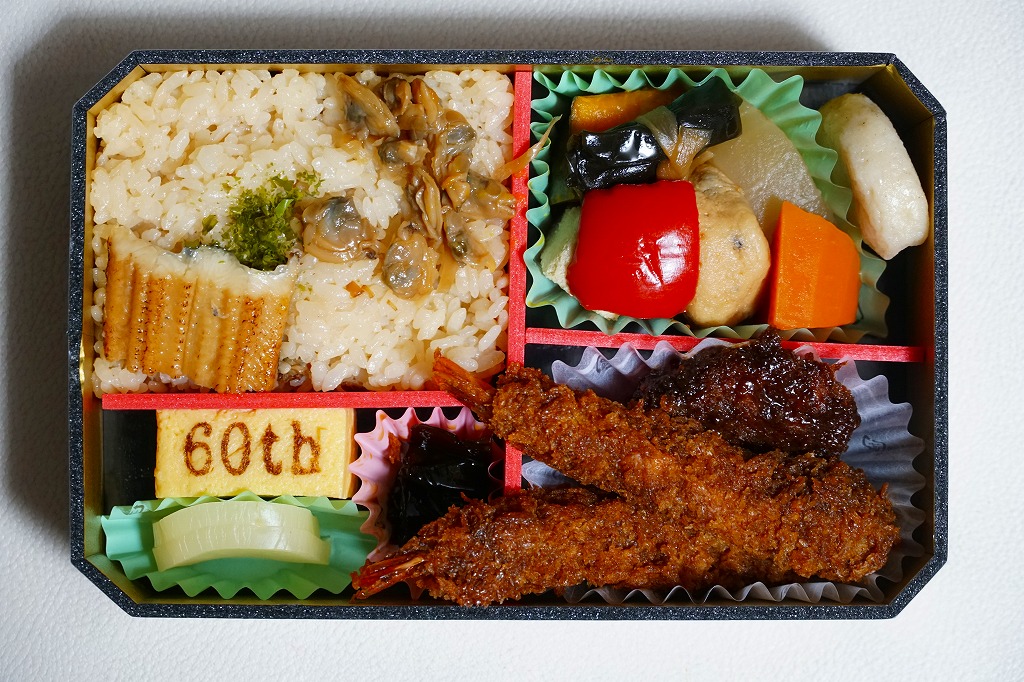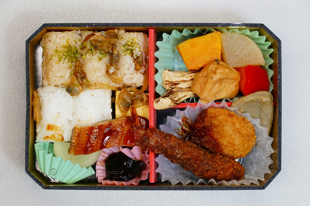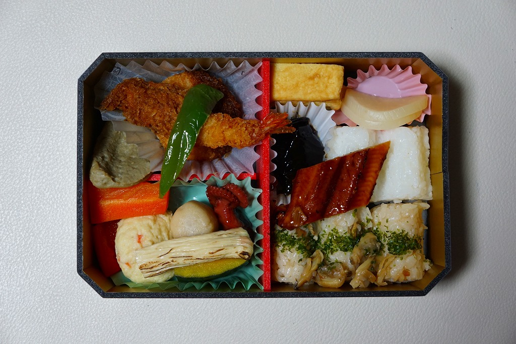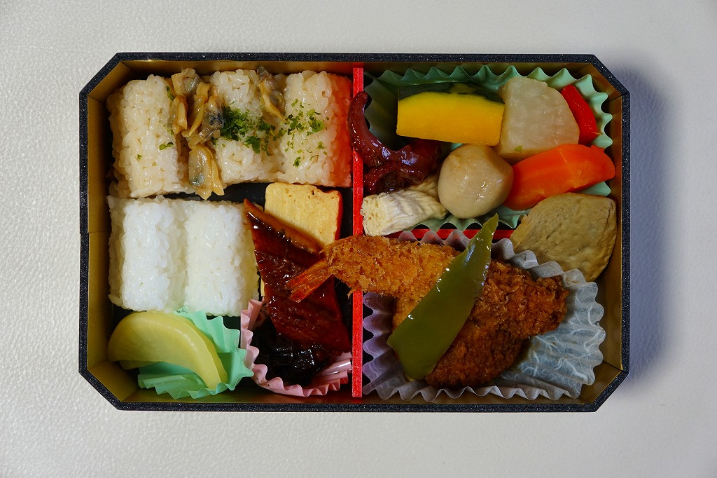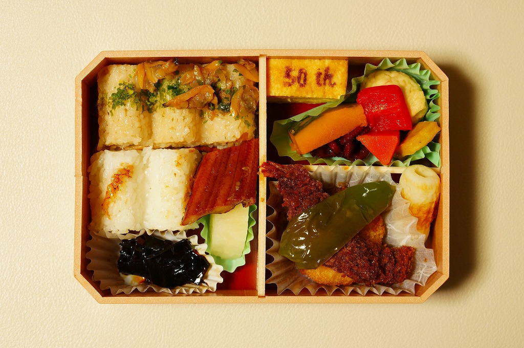 この「東京・品川・新横浜」バージョンの中身は、深川めしと白御飯の俵飯、アナゴ蒲焼、ワサビ昆布、べったら漬、エビフライ、みそかつ、イイダコ煮、50th焼き印の玉子焼、カボチャやニンジンなどの煮物など。箱にゆとりをもって、しかしスカスカにならずに、食材を立てて詰める、味も含めた立体感に美しさを感じる。