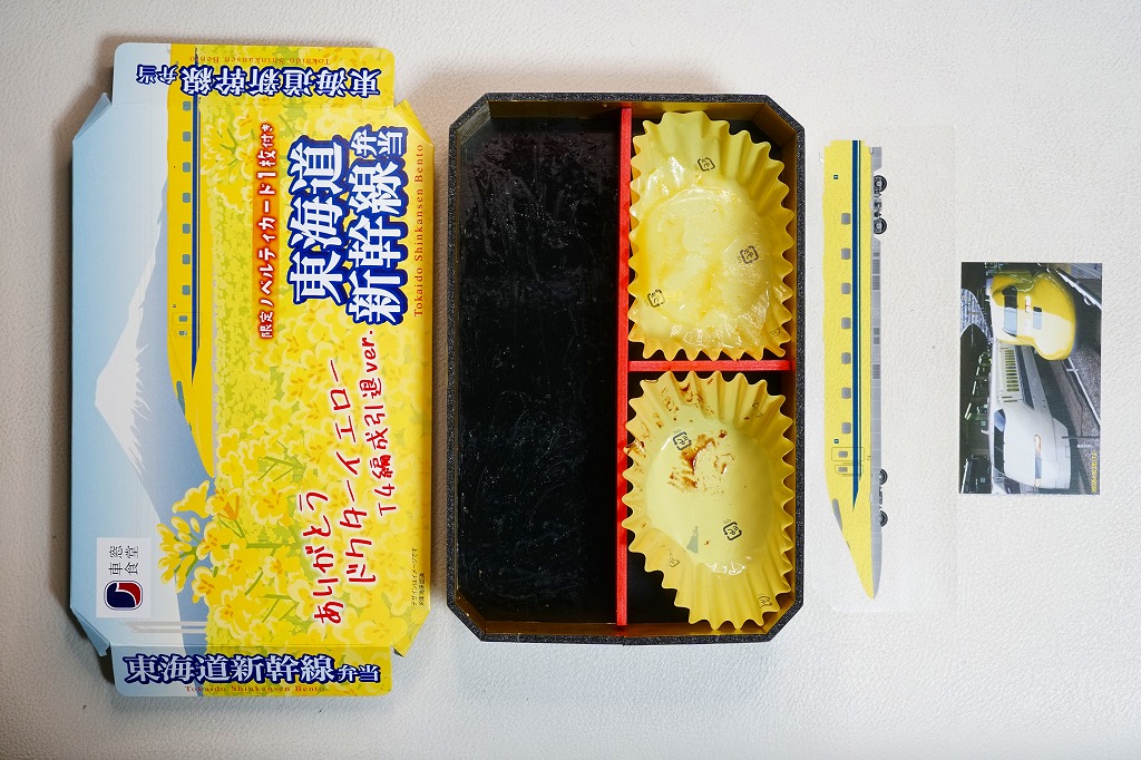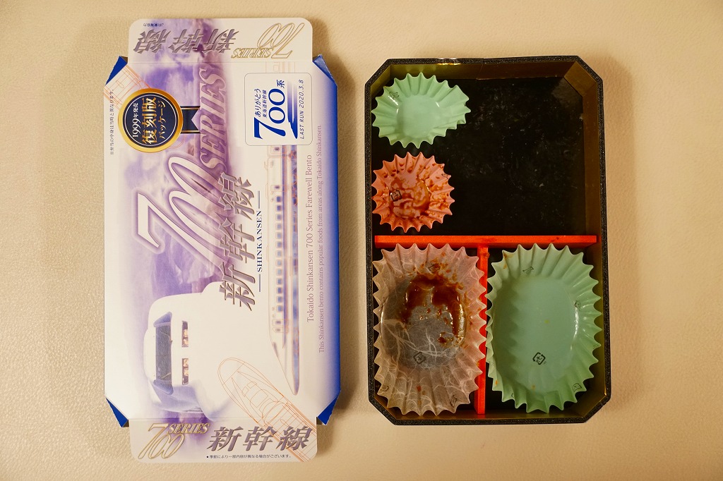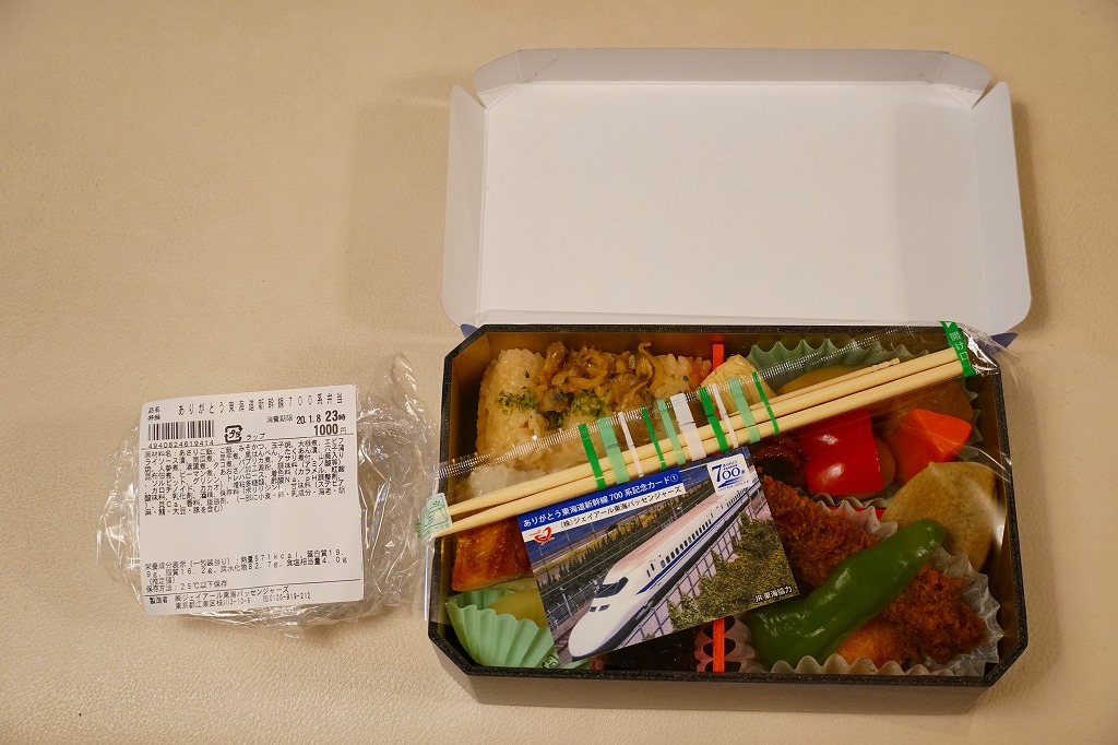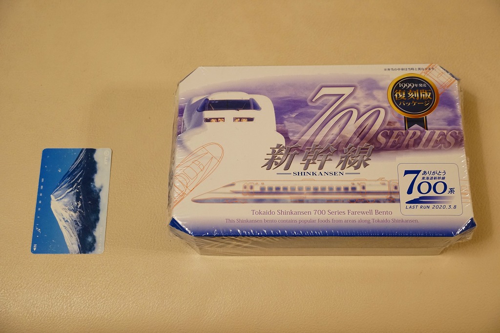 2020(令和2)年1月8日に購入した、東京駅弁のふた。同年3月の東海道新幹線からの700系新幹線電車の撤退に合わせ、同年の1月上旬から3月中旬までの予定で販売された記念駅弁。中身は普段の「東海道新幹線弁当」と同じで、紙ぶたの絵柄を同電車の1999(平成11)年のデビュー当時に売られた駅弁のものとし、「ありがとう東海道新幹線700系記念カード」6種類中1枚を封入した。