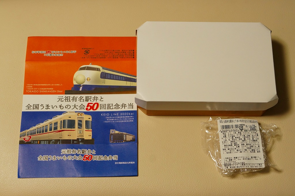 2015(平成27)年1月の京王百貨店の駅弁大会で、東京駅弁として売られたお弁当。掛紙は1964(昭和39)年デビューの東海道新幹線0系電車と、1963(昭和38)年デビューの京王帝都電鉄(当時)5000系電車のイラスト。毎年一度の駅弁大会の第50回記念ということで、50年前の調製元と百貨店親会社の花形車両を掛紙で並べた。中身は下記「東海道新幹線50周年記念弁当」と同じ。「50th」と焼き印した玉子焼も、そのままの姿で収まる。