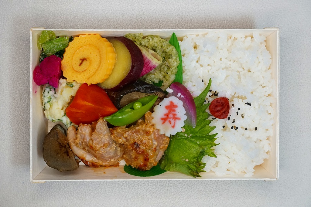 長方形の木質エコ容器の、半分に白飯を詰め、しその葉を介した残る半分に豚肉、れんこん揚げ、かぼちゃやしいたけなどの煮物、ささがきごぼう、玉子焼、さつまいも、小松菜などを折り重ねる。調製元は町田市内でも、町田駅から相模原市を介してはるか遠くの相原町とある。「里山ごはん」の名にふさわしい、それぞれの食材に存在感のあるお弁当だった。