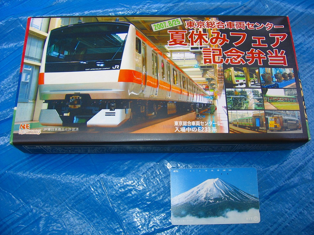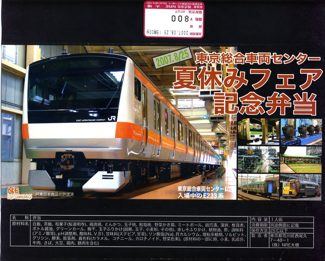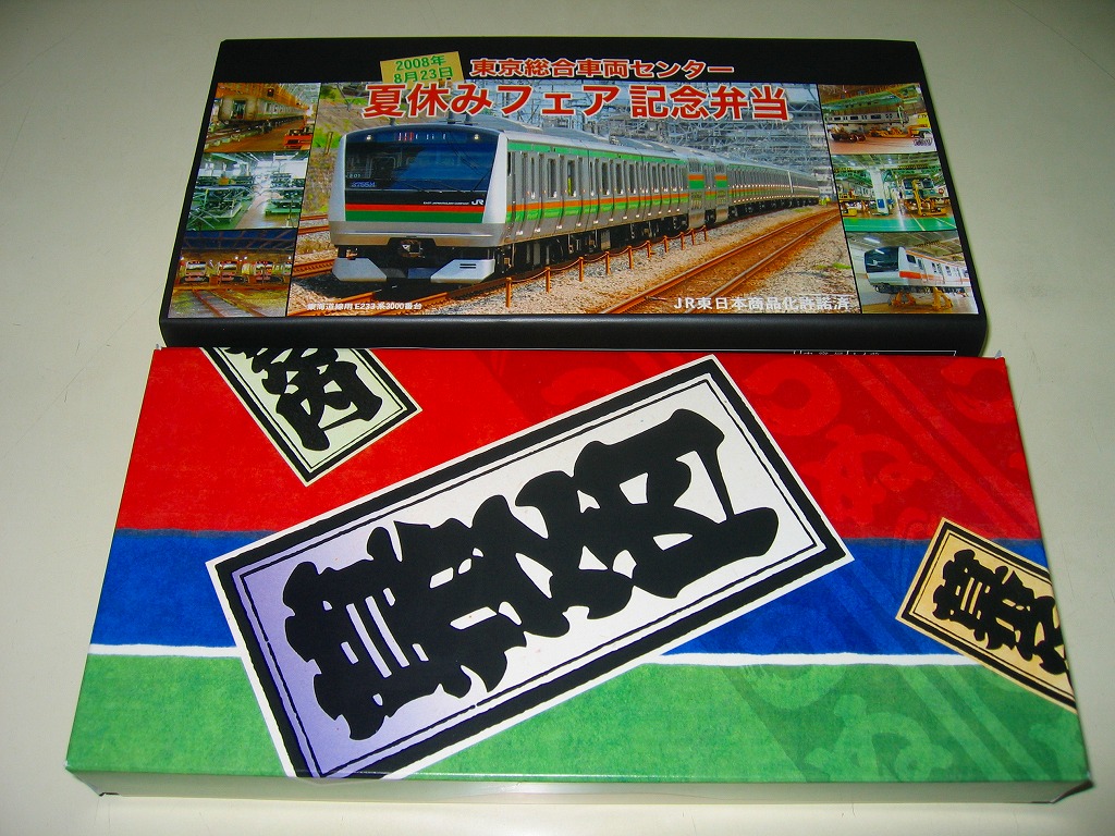 2008(平成20)年8月23日の鉄道工場公開イベントで販売されたお弁当。調製はNREで、今年は東海道線に1編成だけ投入されたE233系3000番台電車の写真を掛紙に採用した。中身や価格およびボール紙製の容器は昨年と同じ。今年も多くの家族連れと鉄道ファンで賑わっていた。