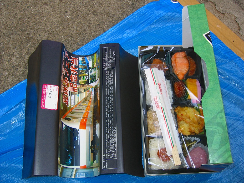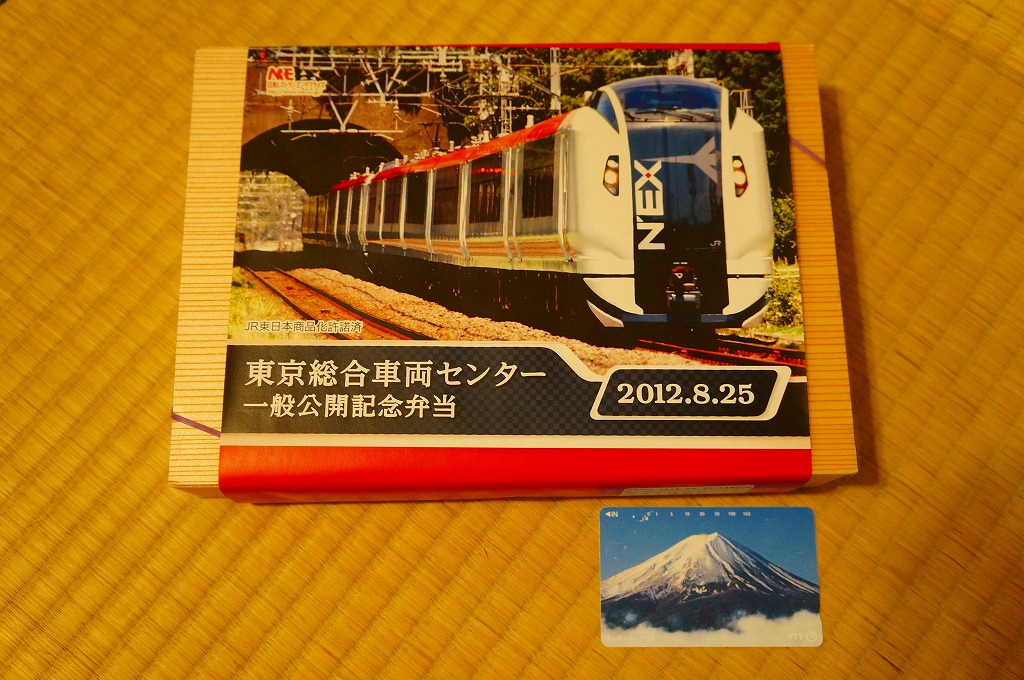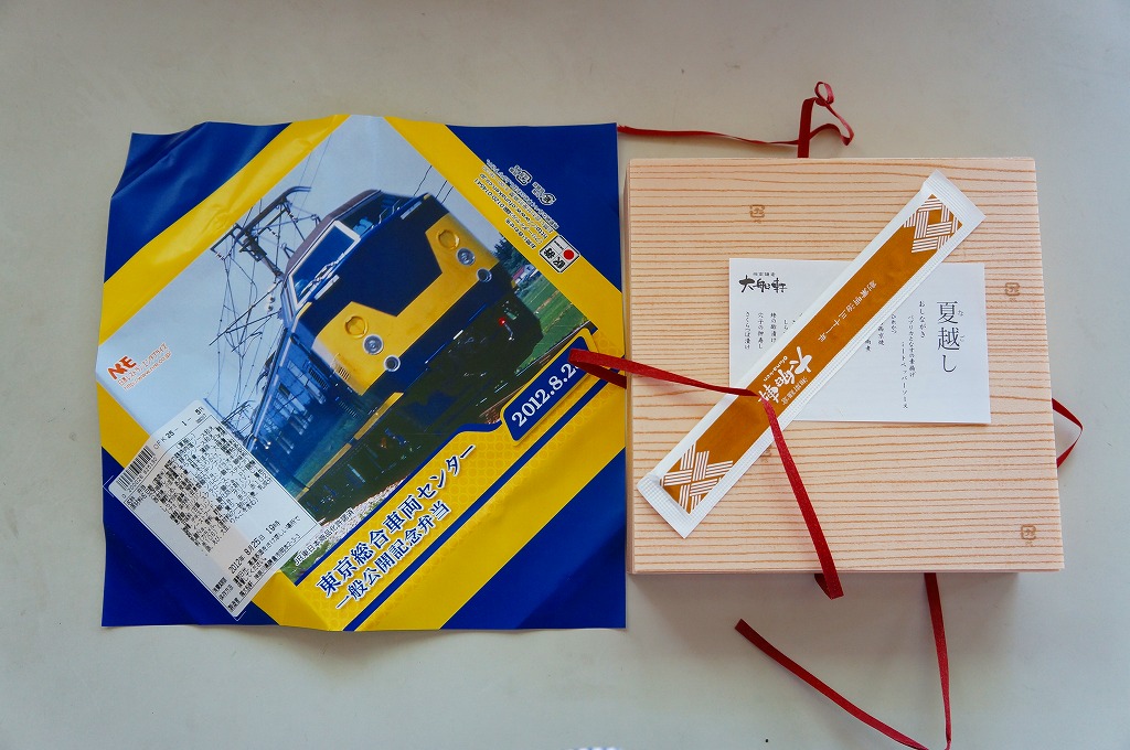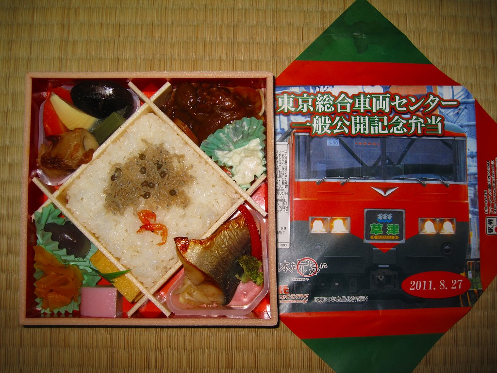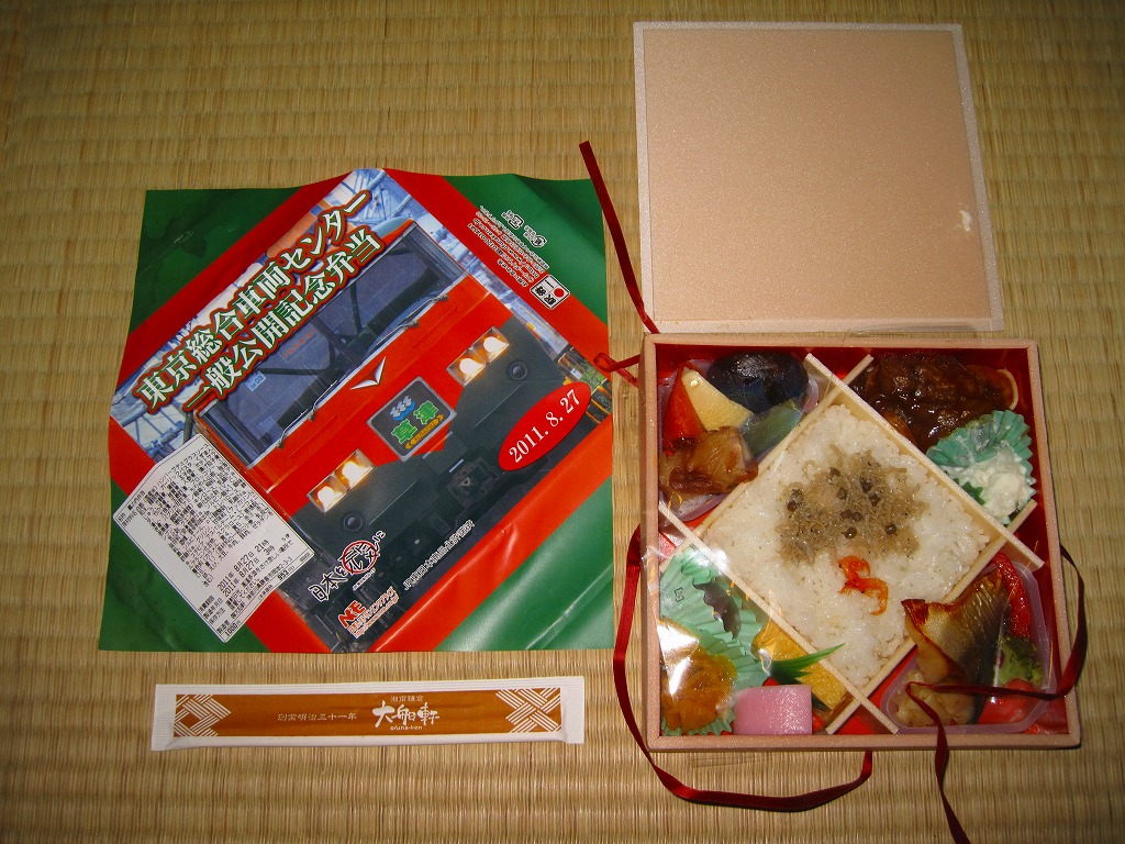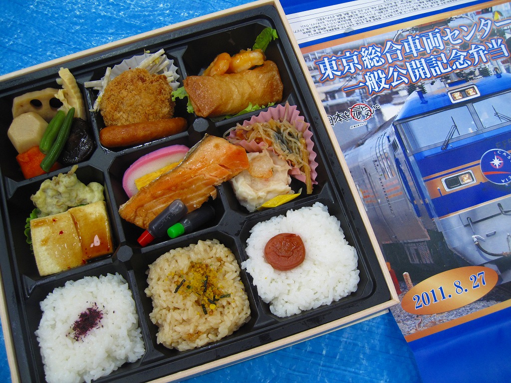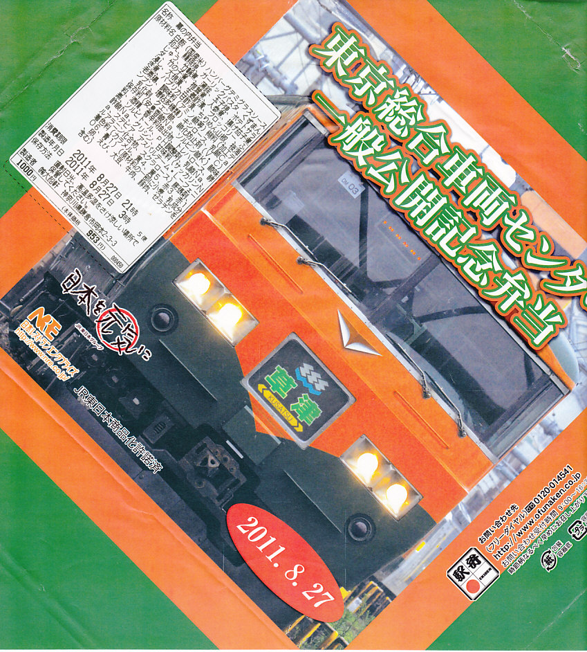 2011(平成23)年8月27日の鉄道工場公開イベントで販売されたお弁当。今年は3種類が用意された。掛紙はJR東日本の185系電車の湘南色バージョン。