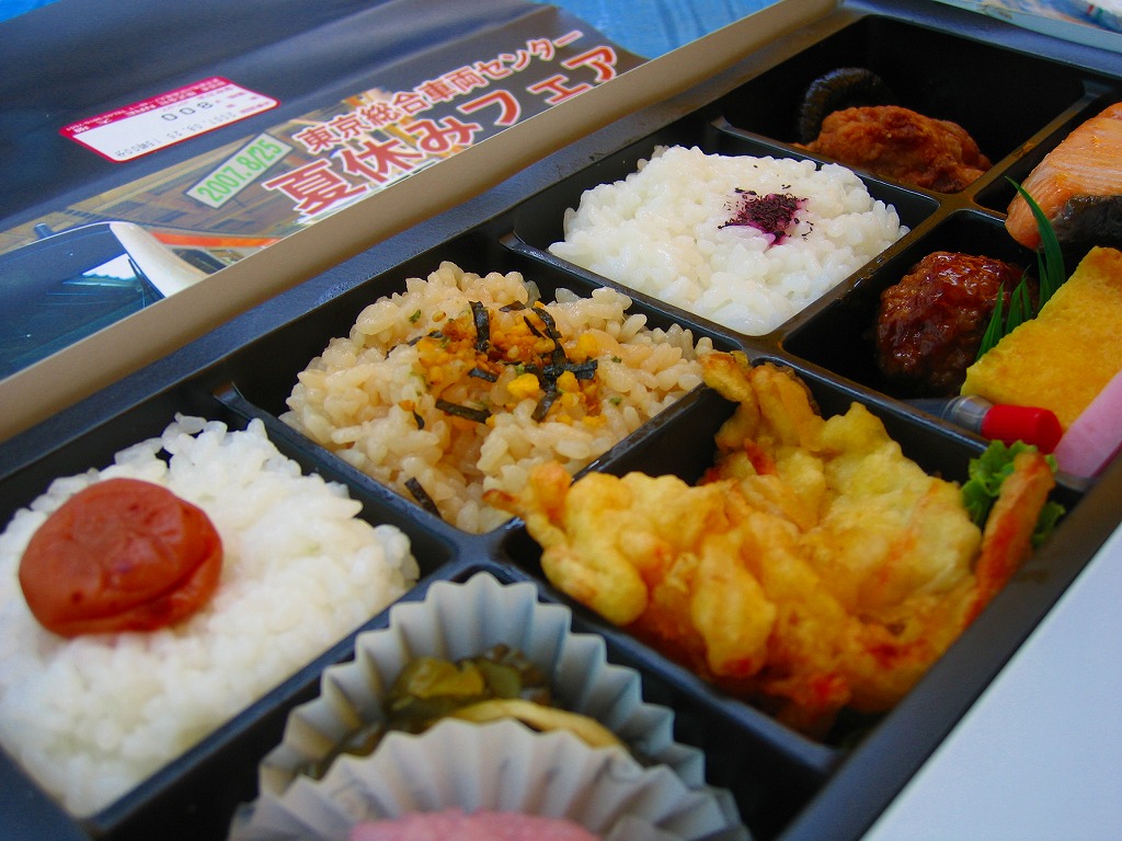 2007(平成19)年8月25日の鉄道工場公開イベントで販売されたお弁当。調製はNREで、新型電車の写真を載せた掛紙の下には見慣れた絵柄の紙箱があり、中身は日の丸御飯、ゆかり白飯、玉子ふりかけ御飯、鳥唐揚、焼鮭ととんかつ、蒲鉾と卵焼きとミートボール、野菜かき揚、桜道明寺など。東京駅その他に同種商品はないと思うが、上のように同時開催の江戸東京博物館での鉄道展では中身がほぼ同じ弁当が売られており、こういうレシピを記念駅弁用で持っているのだろう。ここでは他にもNREの東京駅弁などが販売されていた。