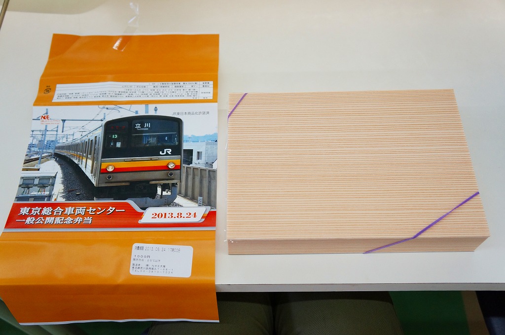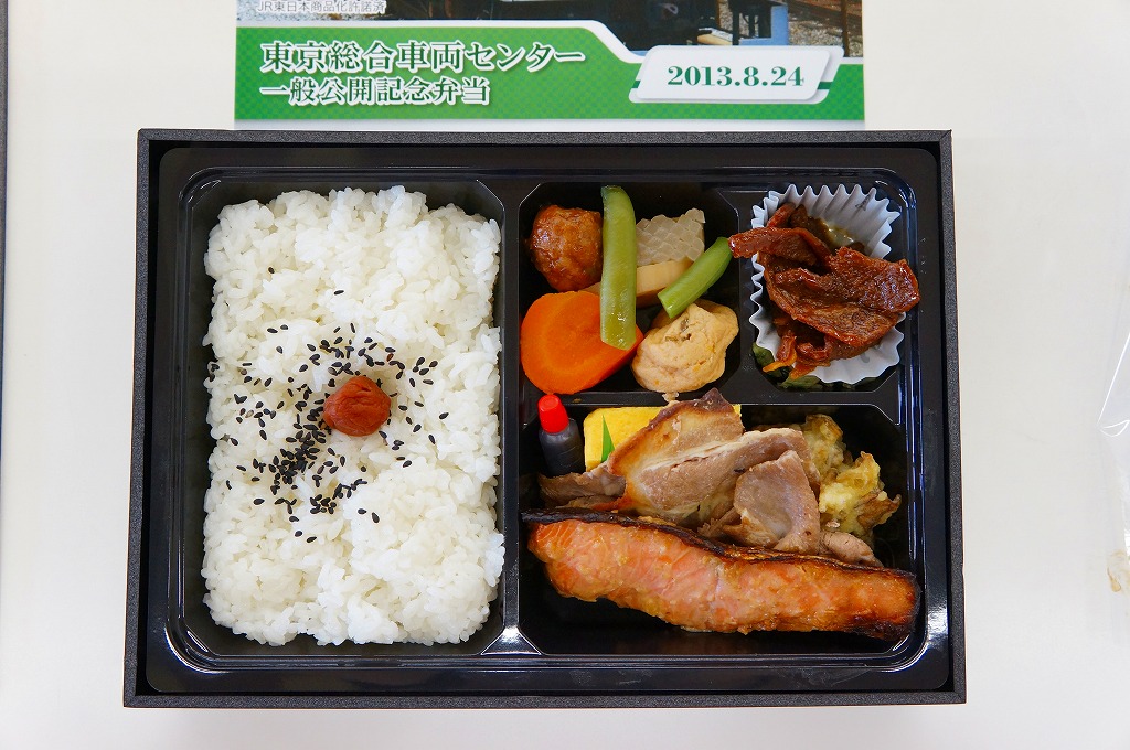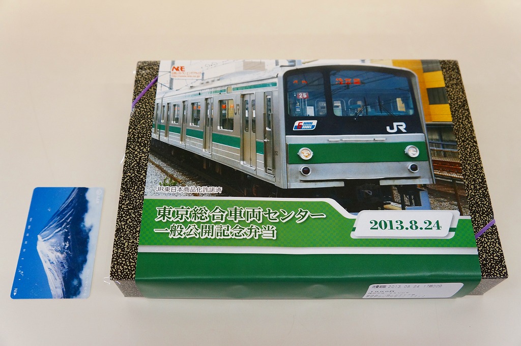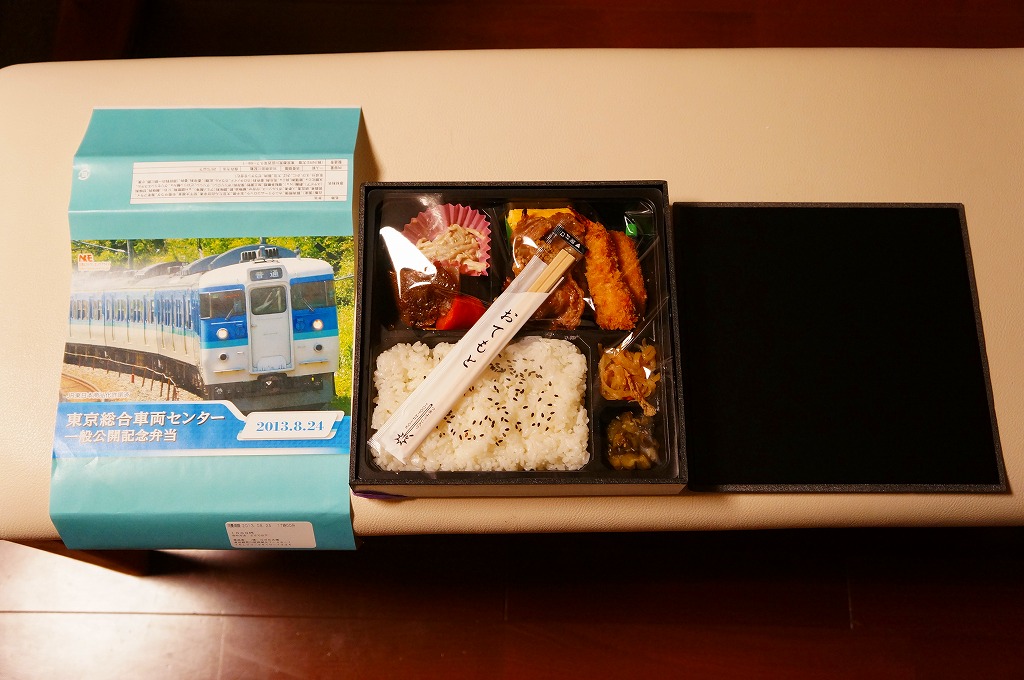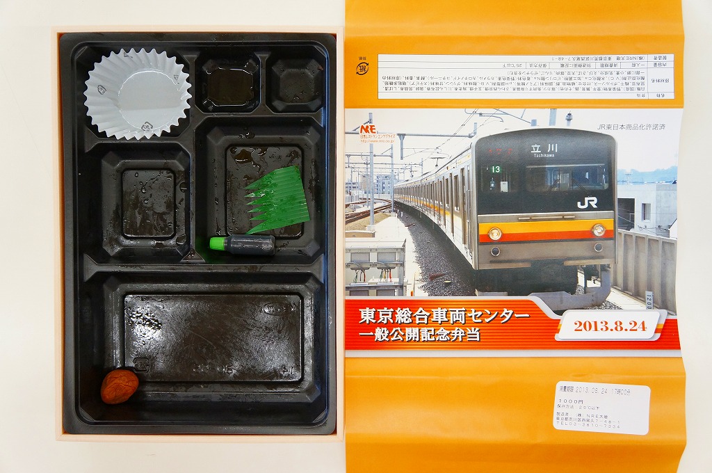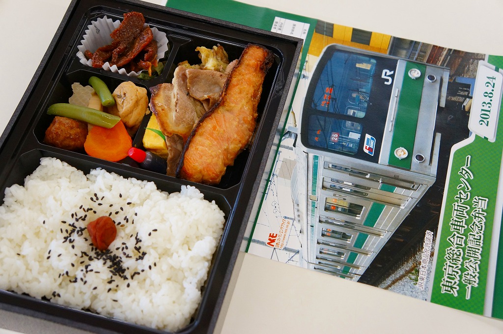 2013(平成25)年8月24日の鉄道工場公開イベントで販売されたお弁当。この年も前年に引き続き、4種類がすべて同じ値段で用意された。掛紙はJR東日本の南武線の205系通勤形電車。中身は普段「ありあけ」の名称でNREが受注生産している宅配弁当。日の丸御飯にサワラ西京焼、有頭海老、とんかつ、昆布豆、玉子焼、煮物など。