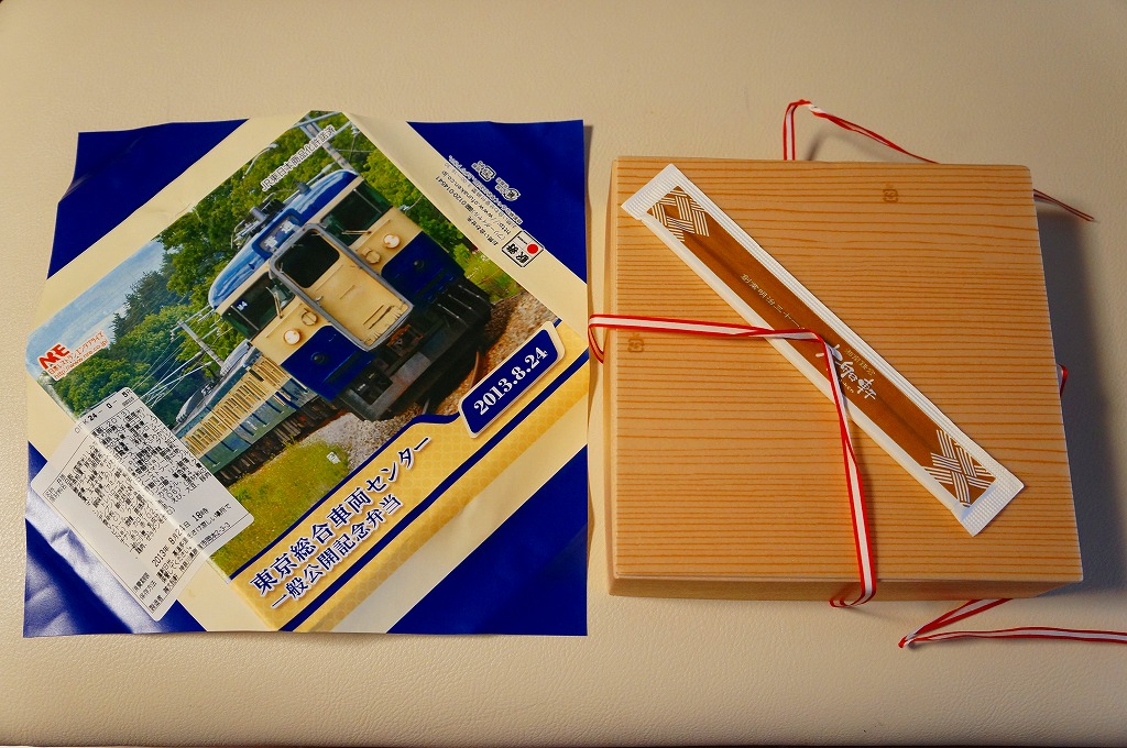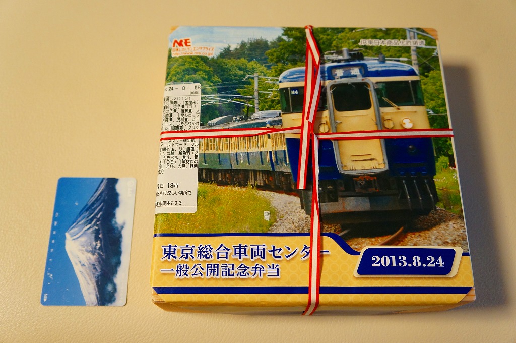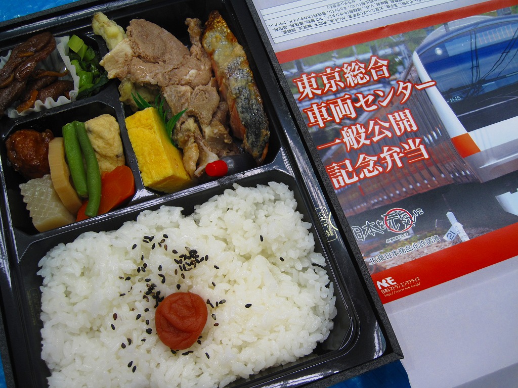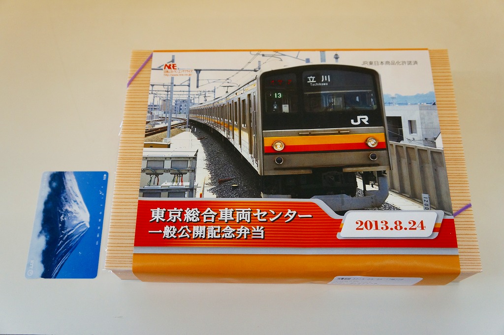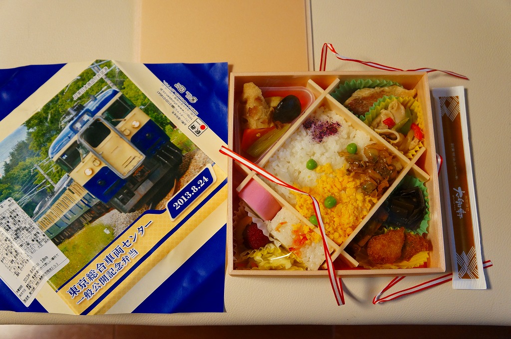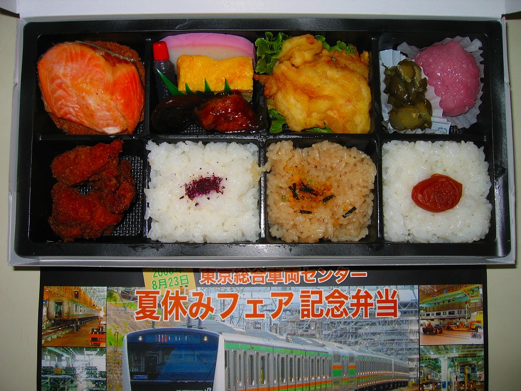 2013(平成25)年8月24日の鉄道工場公開イベントで販売されたお弁当。この年も前年に引き続き、4種類がすべて同じ値段で用意された。掛紙はJR東日本の南武線の205系通勤形電車。中身は普段「ありあけ」の名称でNREが受注生産している宅配弁当。日の丸御飯にサワラ西京焼、有頭海老、とんかつ、昆布豆、玉子焼、煮物など。