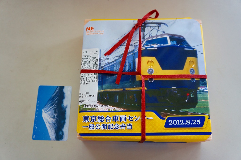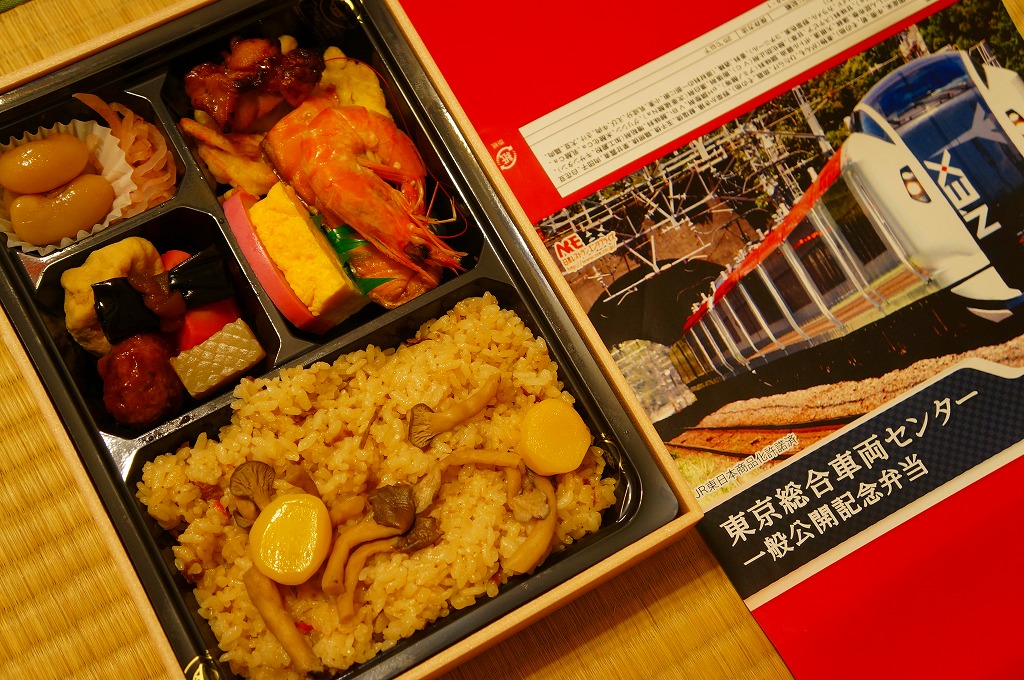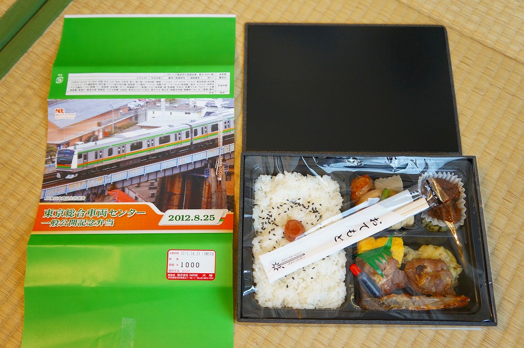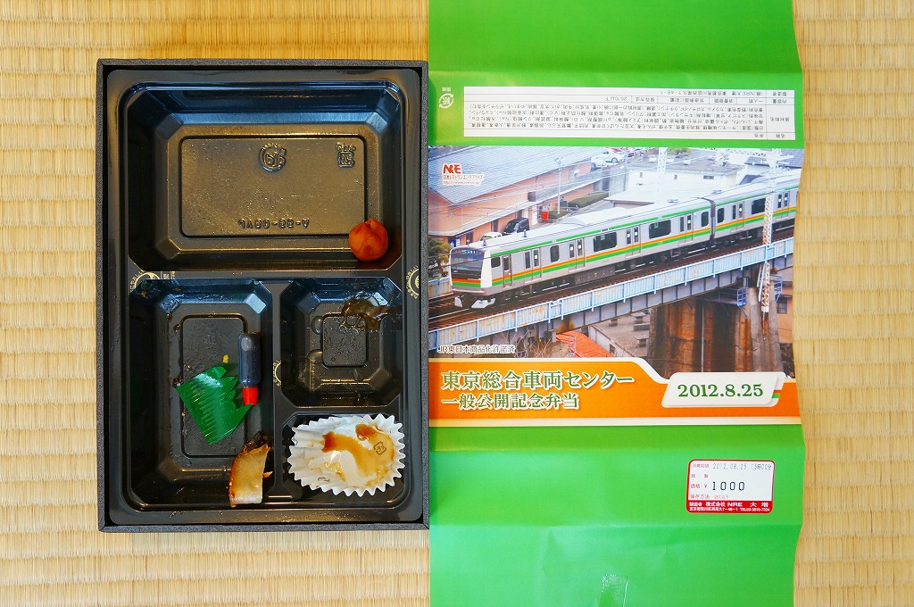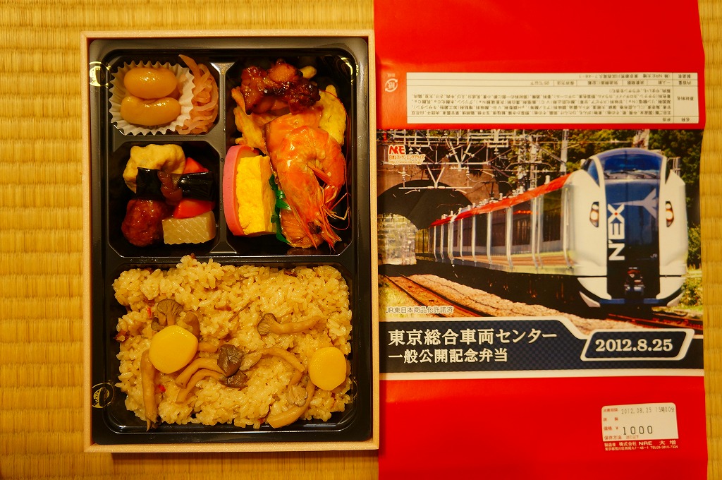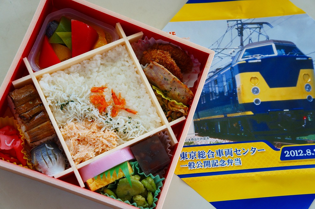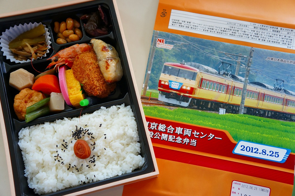 2012(平成24)年8月25日の鉄道工場公開イベントで販売されたお弁当。この年は4種類がすべて同じ値段で用意された。掛紙はJR東日本のE259系特急形電車。中身は普段「せせらぎ」の名称でNREが受注生産している宅配弁当。シメジやタケノコなどの五目飯に有頭海老、鮭塩焼、鶏照焼、野菜かき揚、かまぼこと玉子焼、肉団子と昆布やニンジンなどの煮物、煮豆と紅生姜。今回の4種の中では最もうまかった。
