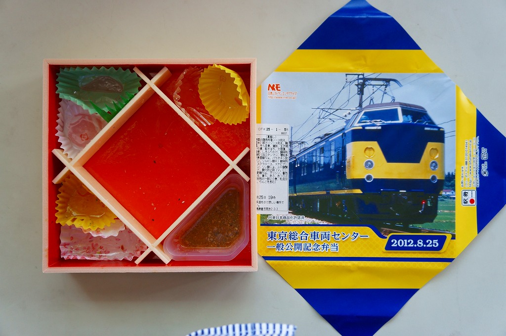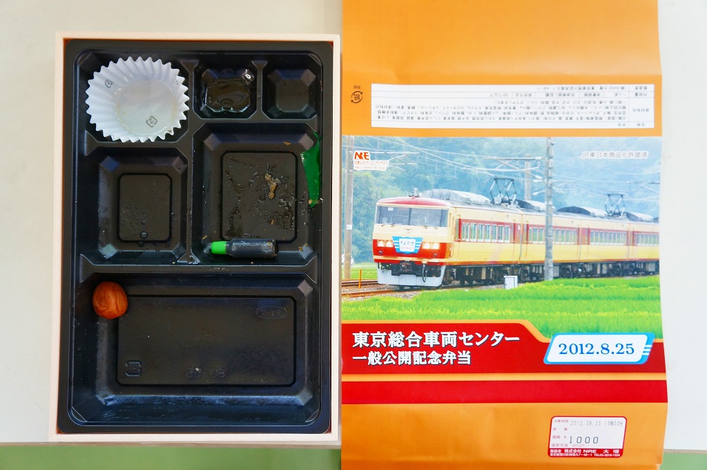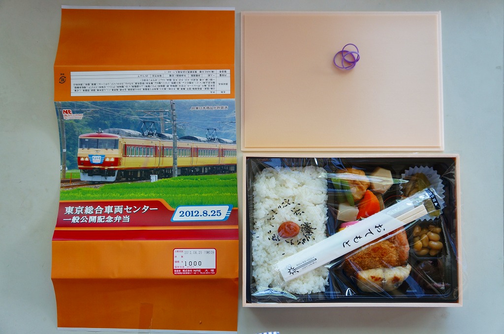 2012(平成24)年8月25日の鉄道工場公開イベントで販売されたお弁当。この年は4種類がすべて同じ値段で用意された。掛紙は185系国鉄色(日光形)で2012年7月15日に上野駅と横川駅との間で運転された臨時特急そよかぜの走行写真。中身は普段「ありあけ」の名称でNREが受注生産している宅配弁当。日の丸御飯にトンカツ、サワラ西京焼、エビ煮、かまぼこ、玉子焼、サトイモやコンニャクなどの煮物、ニシン昆布巻、昆布豆、柴漬けなど。