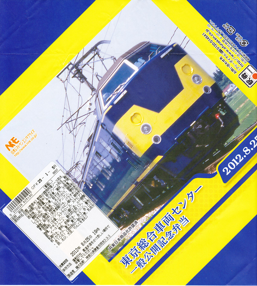 2012(平成24)年8月25日の鉄道工場公開イベントで販売されたお弁当。この年は4種類がすべて同じ値段で用意された。掛紙は国鉄時代に製造されJR東日本が保有し東京総合車両センターで保管されている193系事業用電車で、走りながら直流電化区間の信号や架線の状態をチェックする電気検測車。