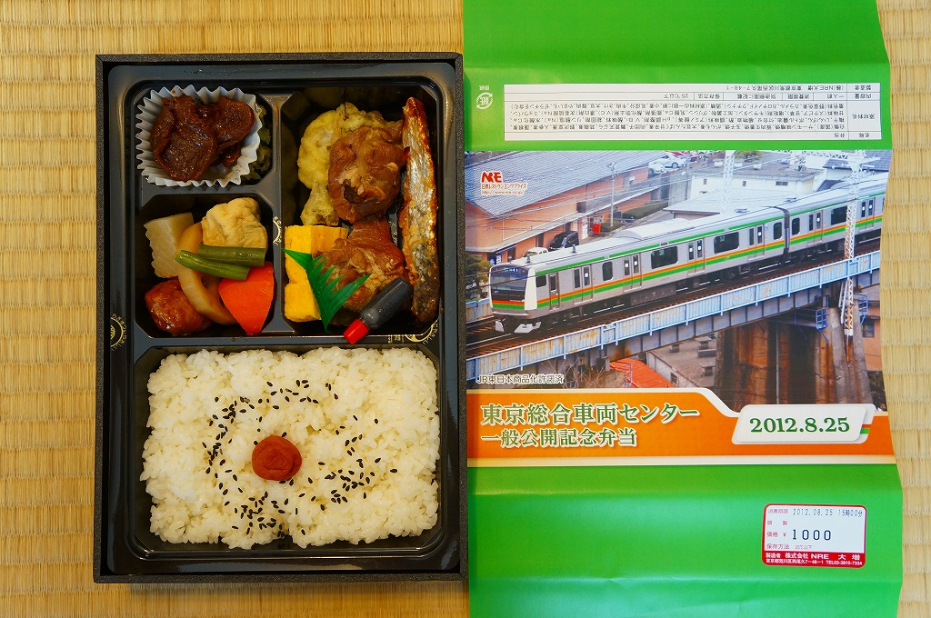 2012(平成24)年8月25日の鉄道工場公開イベントで販売されたお弁当。この年は4種類がすべて同じ値段で用意された。掛紙はE233系電車のうち東海道線などで使われる3000番台。中身は普段「はつらつ」の名称でNREが受注生産している宅配弁当。日の丸御飯にサーモン味噌焼、豚肉生姜焼、マイタケ天、玉子焼、レンコンやタケノコなどの煮物、人造肉(大豆たんぱく)甘辛煮。豚肉と人造肉がえらく臭かったような。