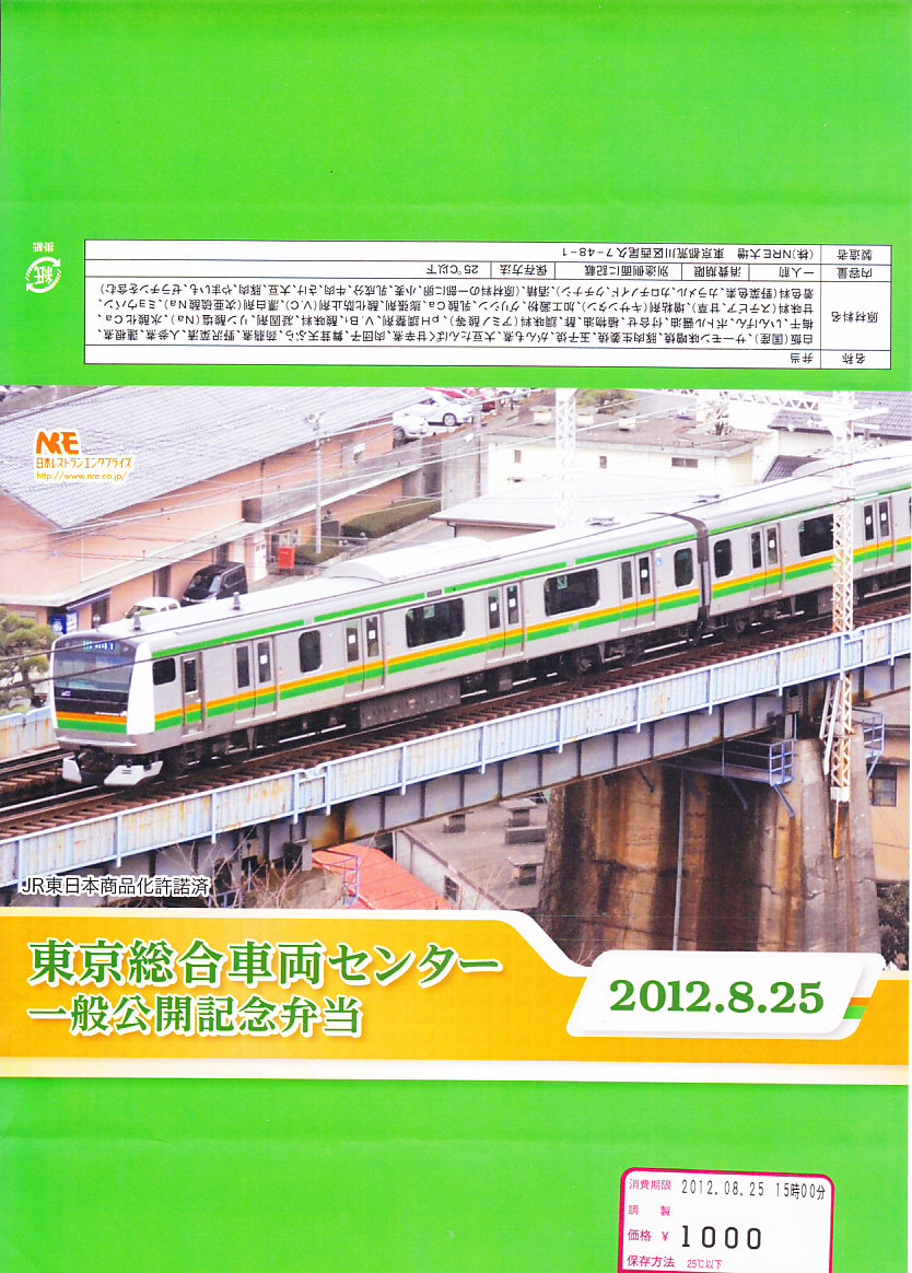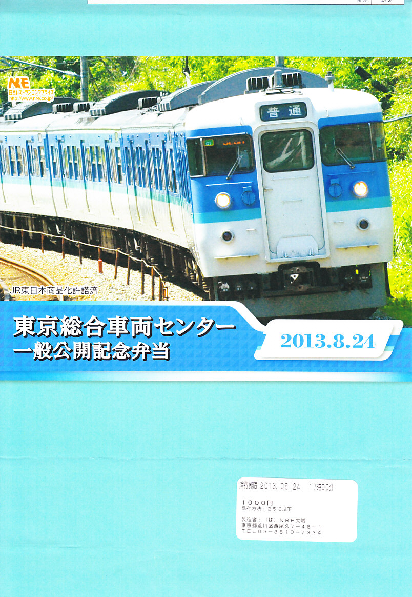 2013(平成25)年8月24日の鉄道工場公開イベントで販売されたお弁当。この年も前年に引き続き、4種類がすべて同じ値段で用意された。掛紙はJR東日本の中央本線の115系近郊形電車。中身は大船駅の夏季限定駅弁「夏越し」。つまり調製元は大船軒で、食品表示ラベルもそうであるが、掛紙にはNREのロゴマークのみが印刷されていた。