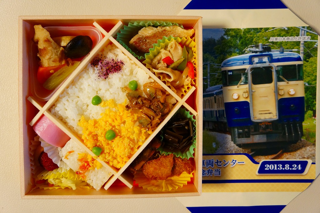 2013(平成25)年8月24日の鉄道工場公開イベントで販売されたお弁当。この年も前年に引き続き、4種類がすべて同じ値段で用意された。掛紙はJR東日本の長野地区の115系近郊形電車。中身は普段「はつらつ」の名称でNREが受注生産している宅配弁当。白御飯に豚肉照焼、エビフライ、カニクリームコロッケ、大豆たんぱく甘辛煮、ごぼうサラダ、切り干しダイコン、玉子焼など。今回の3つのNREの弁当もまた、東京駅でおなじみの安定した味。