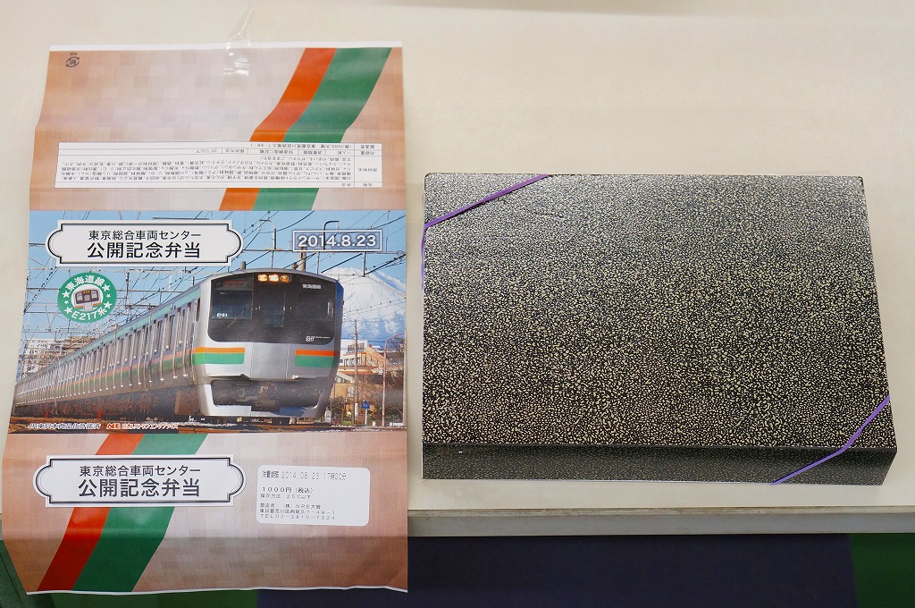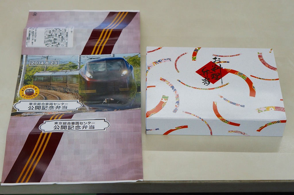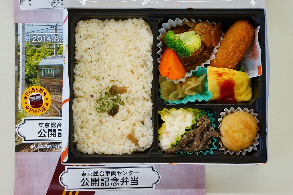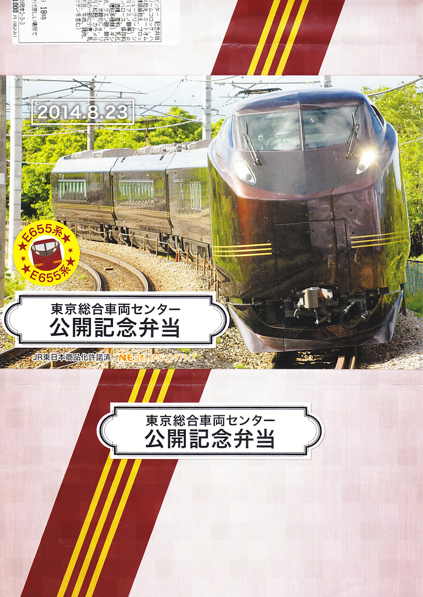 2014(平成26)年8月23日の鉄道工場公開イベントで販売されたお弁当。この年の記念弁当は、NREこそ前年と同じく3種類を用意したが、大船軒のものは無かった。しかしよく見ると、この弁当のみ食品表示ラベル上は、調製元が大船軒である。掛紙は皇室用客車の代替として2007(平成19)年にJR東日本が製造した「ハイグレード車両」E655系電車。